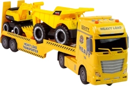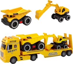 Opdag et stort byggesæt, der glæder alle små fans af arbejdsmaskiner. Autotransporteren med bevægelig læsserampe laster og losser nemt de medfølgende maskiner. Realistiske blinkende advarselslygter og motor-, horn- og sirenelyde, aktiveret via knapper, giver ekstra autenticitet. Gravemaskinen har en manuel styret arm med skovl, og tipvognen er udstyret med en opklappelig ladkasse til “aflæsning af materiale”.