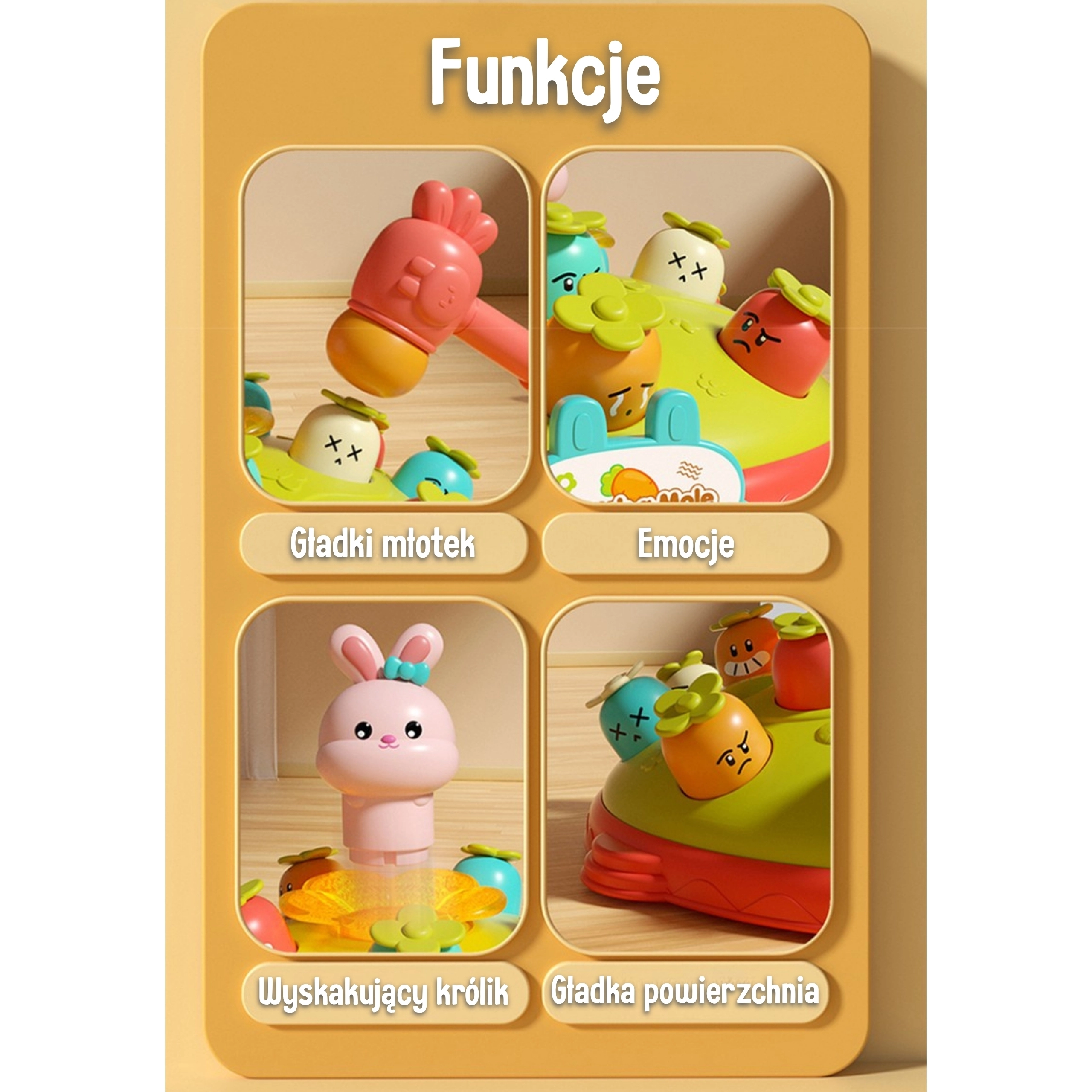 Det underholdende og sikre interaktive spil fra mærket WOOPIE giver børn fra 18 måneder timevis af glæde og læring. Børn slår blidt med en blød hammer på “muldvarpe” og forbedrer dermed reflekser, hånd-øje-koordination og koncentration. Farvede lys, glade melodier og et venligt design med gulerødder og kaniner øger motivationen for leg. Spillet er lavet af materialer i høj kvalitet, har glatte kanter og en blød hammer for maksimal sikkerhed for små hænder.