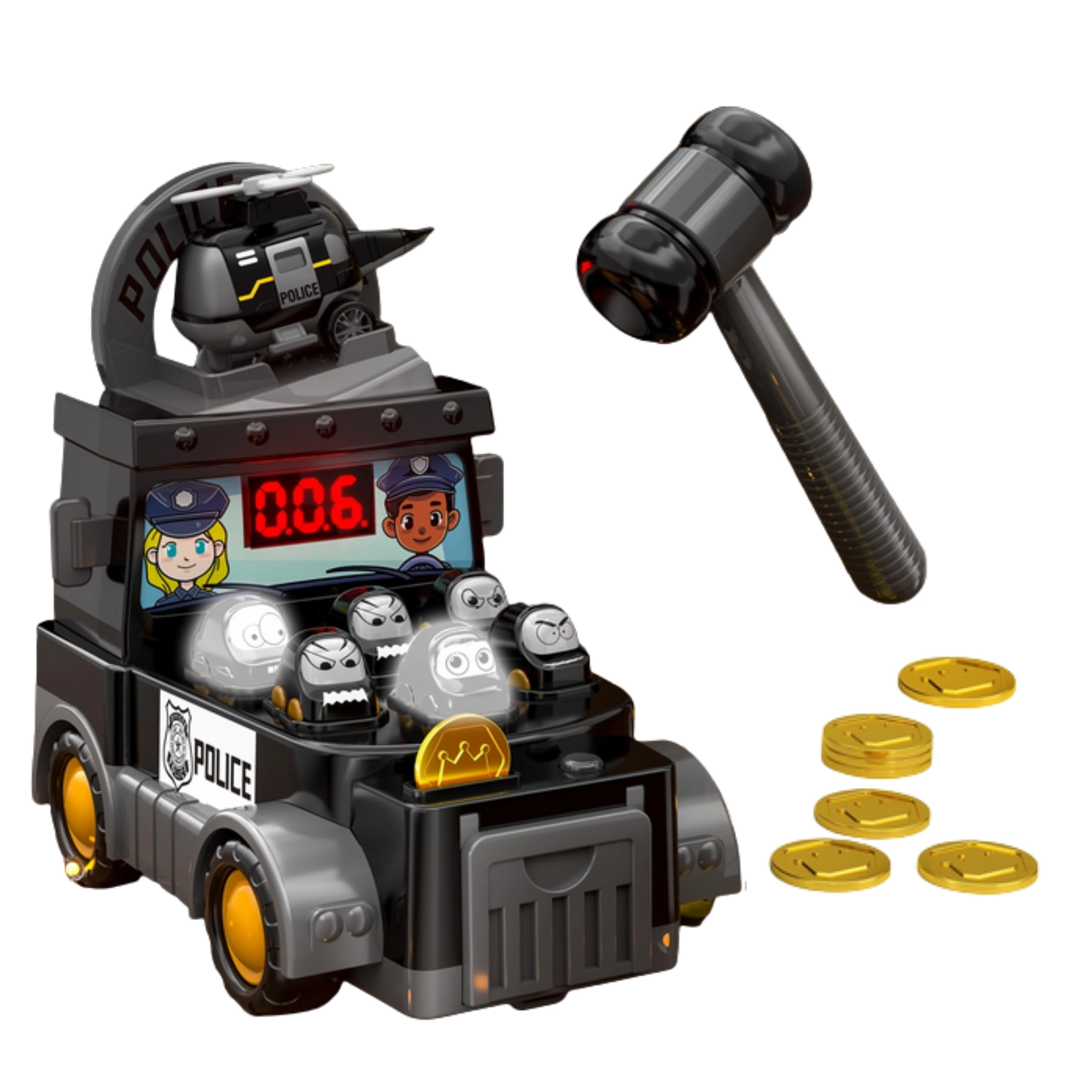 Politiversionen af det populære spil Slå muldvarpen begejstrer børn fra 3 år. Tag den bløde hammer og ram “skurkene”, der springer op af hullerne i radiobilen. Takket være scoredisplayet kan børn nemt følge deres præstation og konkurrere med venner eller forældre.