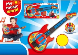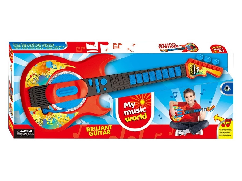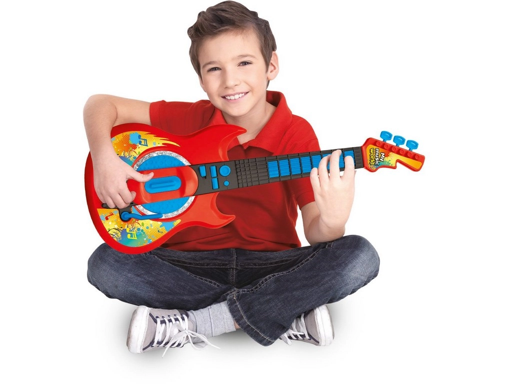 Praktiske betjeningsknapper og behagelige dimensioner sikrer komfortabel spilning selv for små børnehænder. Guitarens tilstande omfatter både fri spilning og forudindstillede melodier, så barnet let kan komme i gang og gradvist blive bedre.