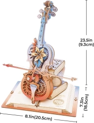Det magiske cello er et stilfuldt mekanisk træpuslespil og en spilledåse i ét. Når den er samlet, bevæger buen sig yndefuldt, tandhjulene vækkes stille til live, og en elegant lilje roterer på toppen. Helheden står på en sokkel, der minder om åbne bøger – et symbol på fantasi og kunst, som gør modellen til en enestående dekoration til stue, arbejdsværelse eller studieværelse.