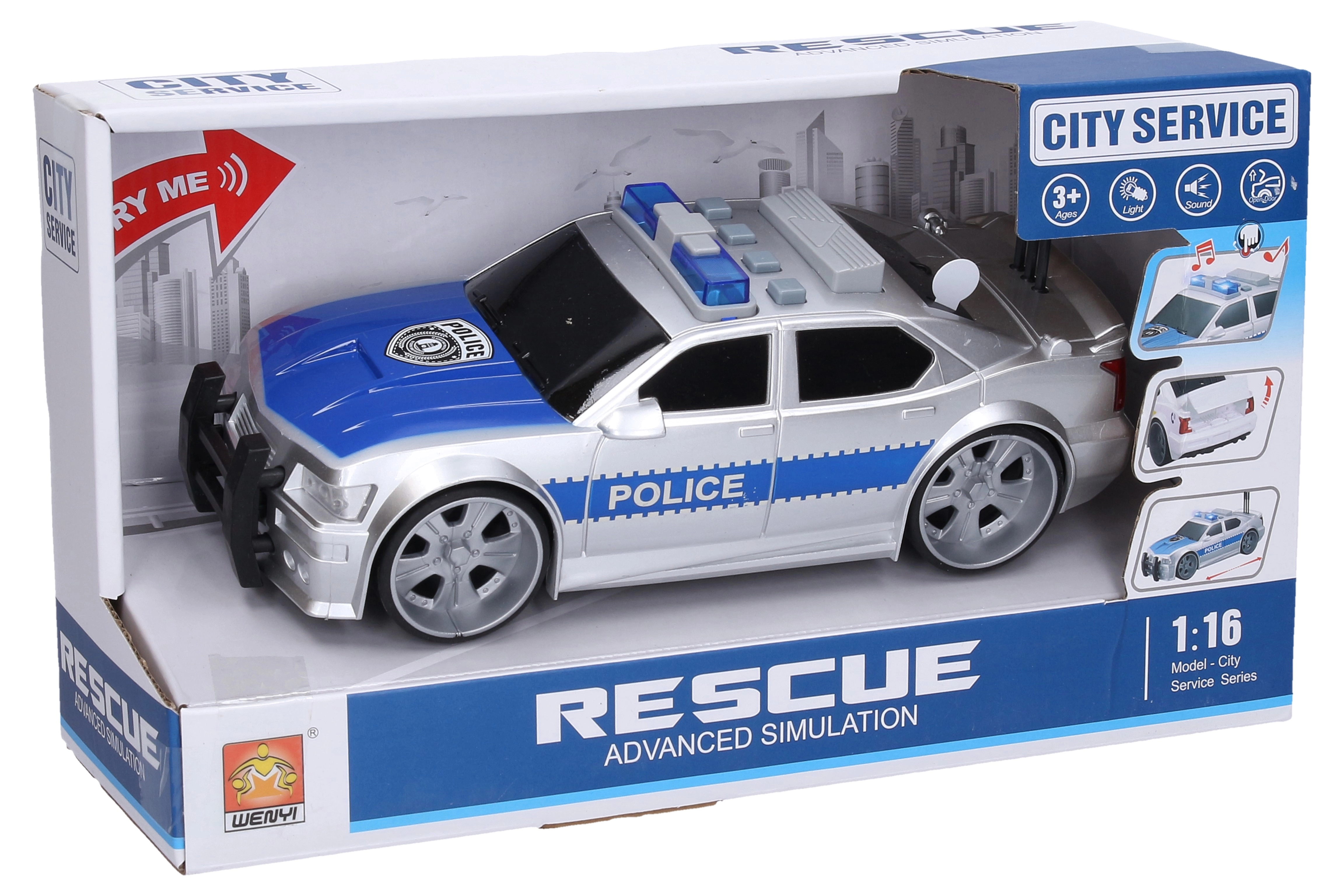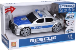 Tag ud på opgave med en detaljeret politibil på 27 cm. Takket være friktionsdriften sætter bilen let i bevægelse, og de realistiske lys- og lydeffekter (motor, bakning, horn, blink) gør hver indsats endnu mere spændende. Motorhjelmen åbnes med et enkelt tryk på knappen på taget.