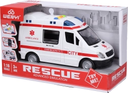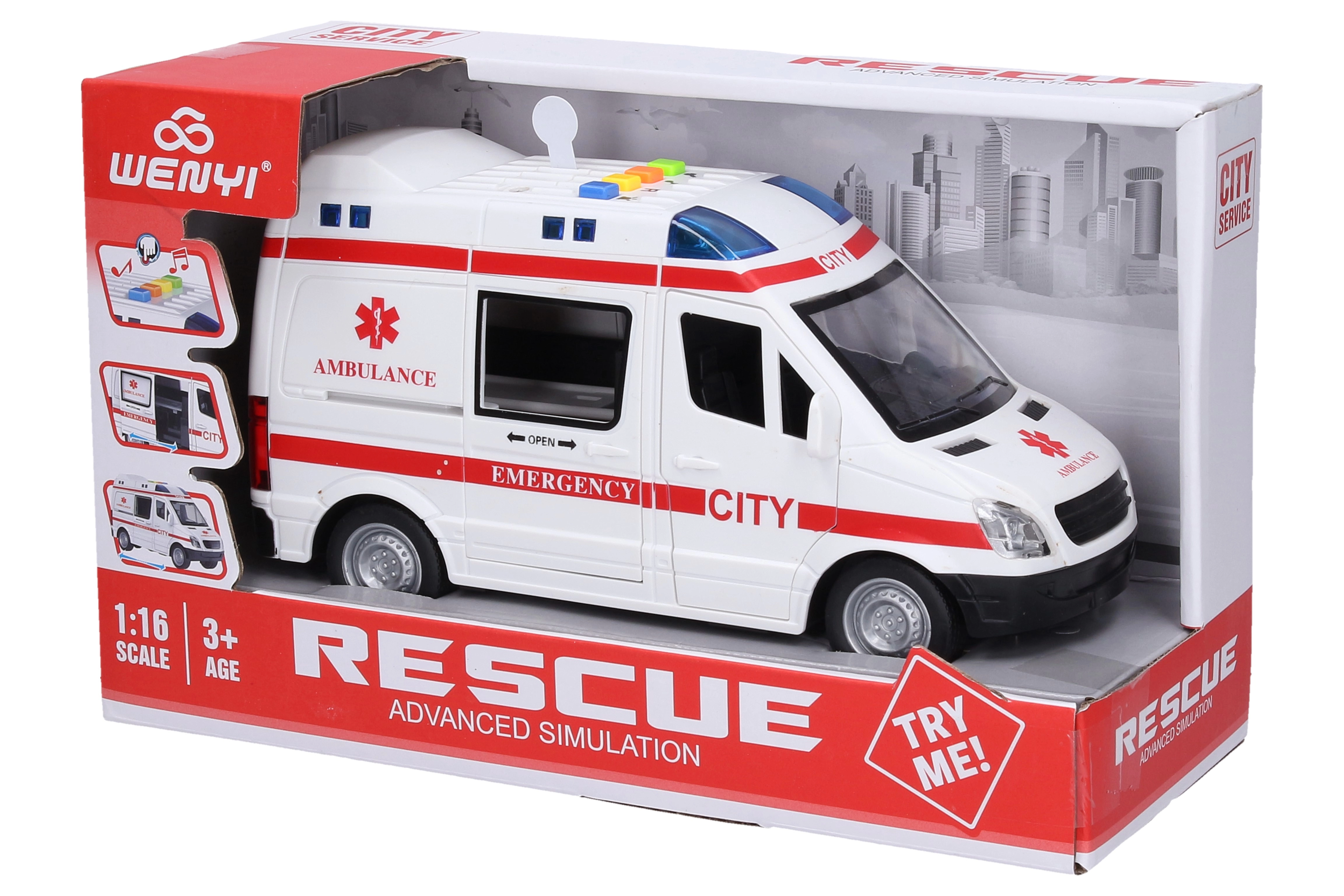 Realistisk ambulance med friktionsdrev på 21 cm med lys- og lydeffekter. Den har åbnbar fordør og skydedør bagtil for endnu mere leg. Batterier 3× AG13 er inkluderet, så børn kan lege med det samme efter udpakning.