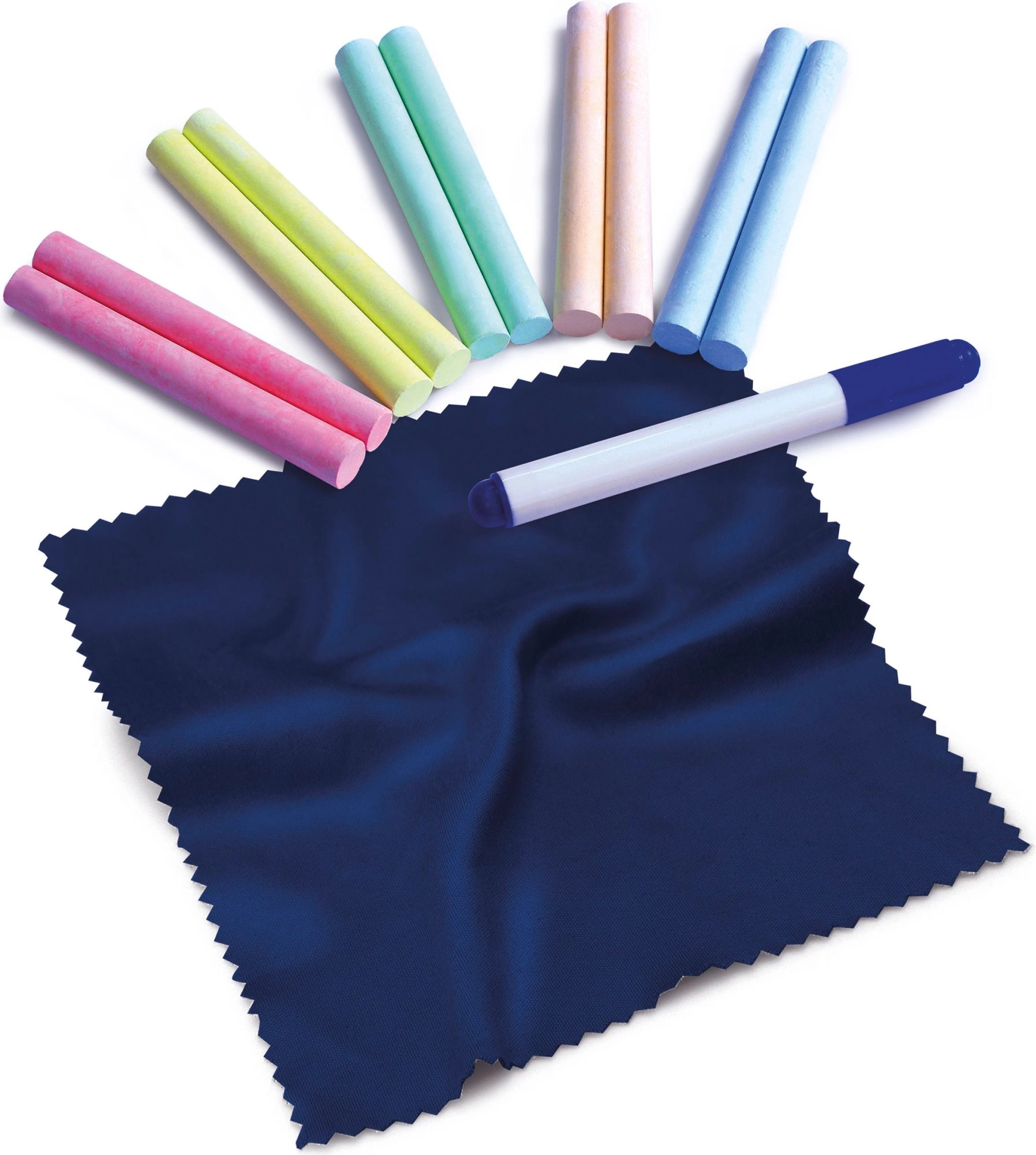 Inkluderer en æske med 10 kridt, 1 sort tørbar marker og en viskeklud – så kan I tegne med det samme efter udpakning.