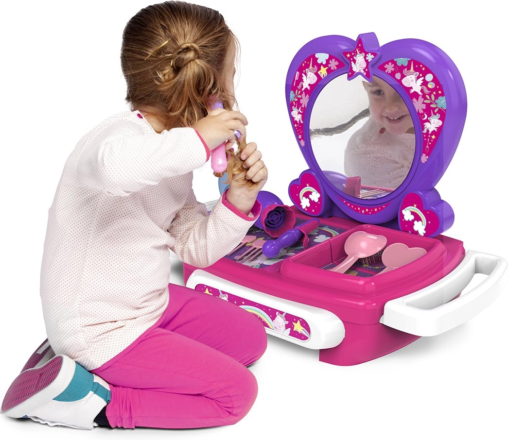 Giv børn adgang til fantasi og rollegleg med dette fortryllende kosmetikbord, ideelt til “frisering”, “sminke” og hårpleje. Med det store spejl og den overskuelige opbevaring er alt tilbehør altid lige ved hånden.