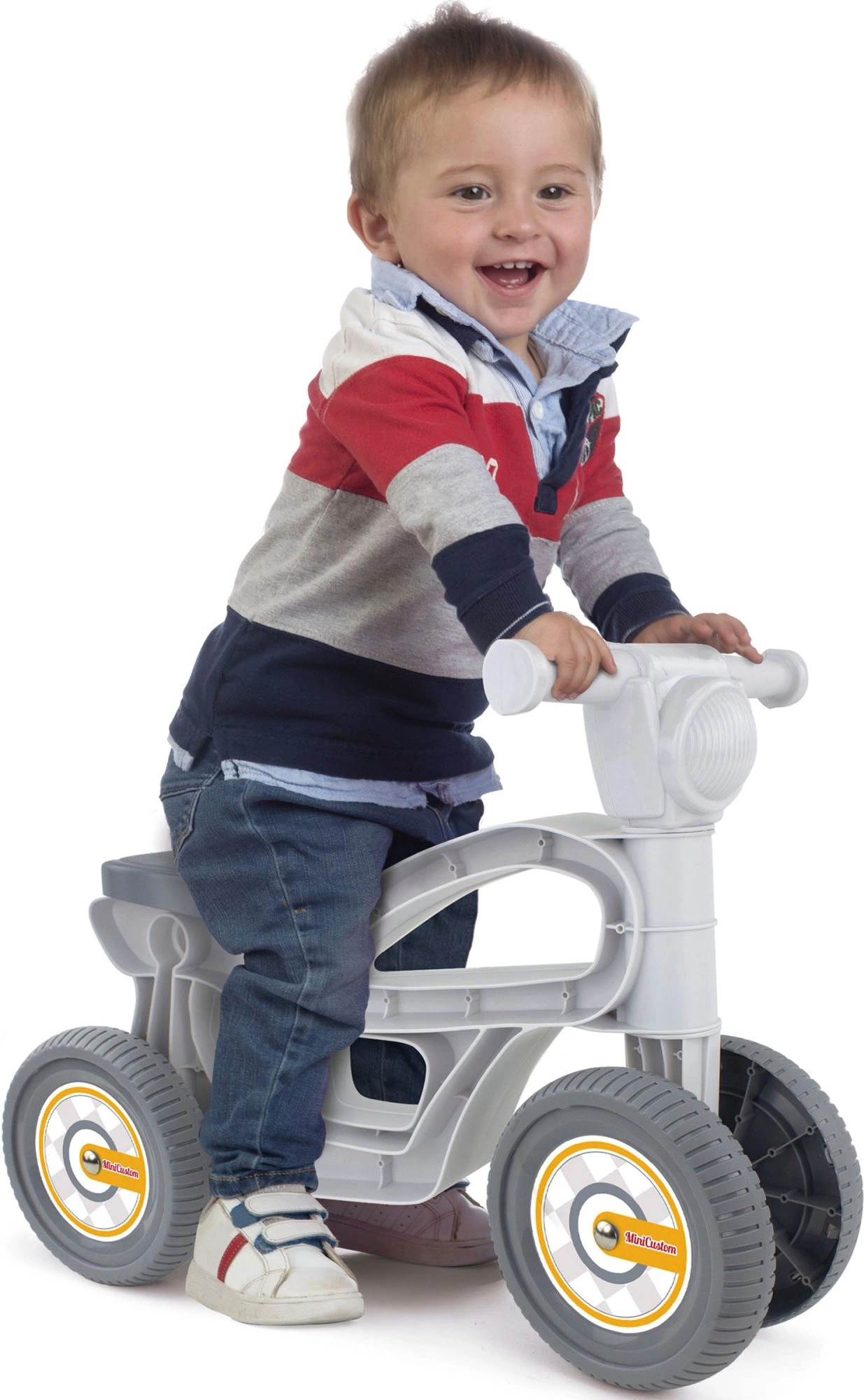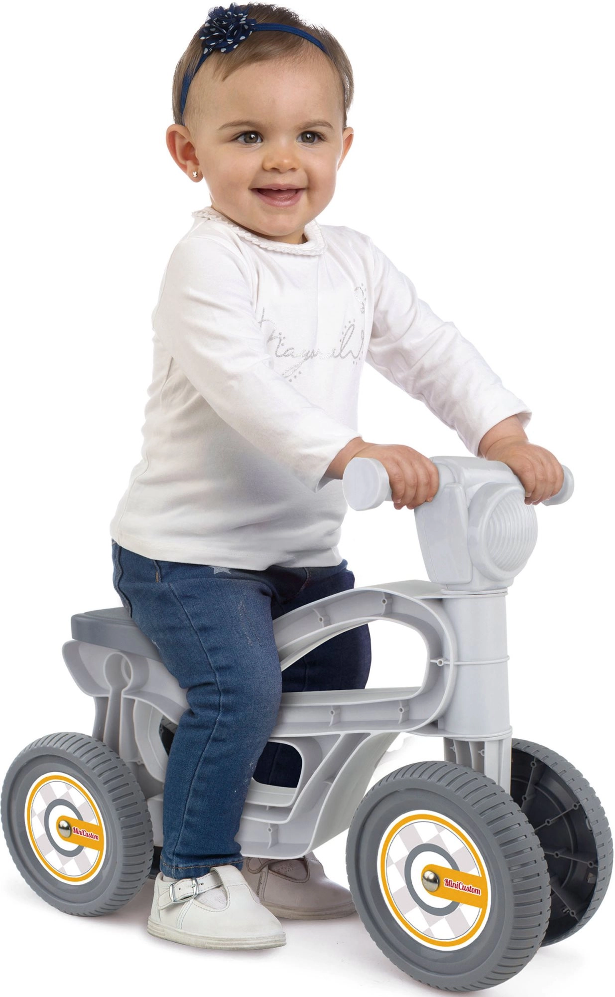 Opdag den grå løbecykel Mini Custom CHICOS – en attraktiv “motorcykel” til de mindste kørere. Takket være den lave vægt og de fire hjul er kørslen stabil og sikker, hvilket understøtter udviklingen af motorik og balance. Den robuste konstruktion tåler daglig brug både i hjemmet og i haven.