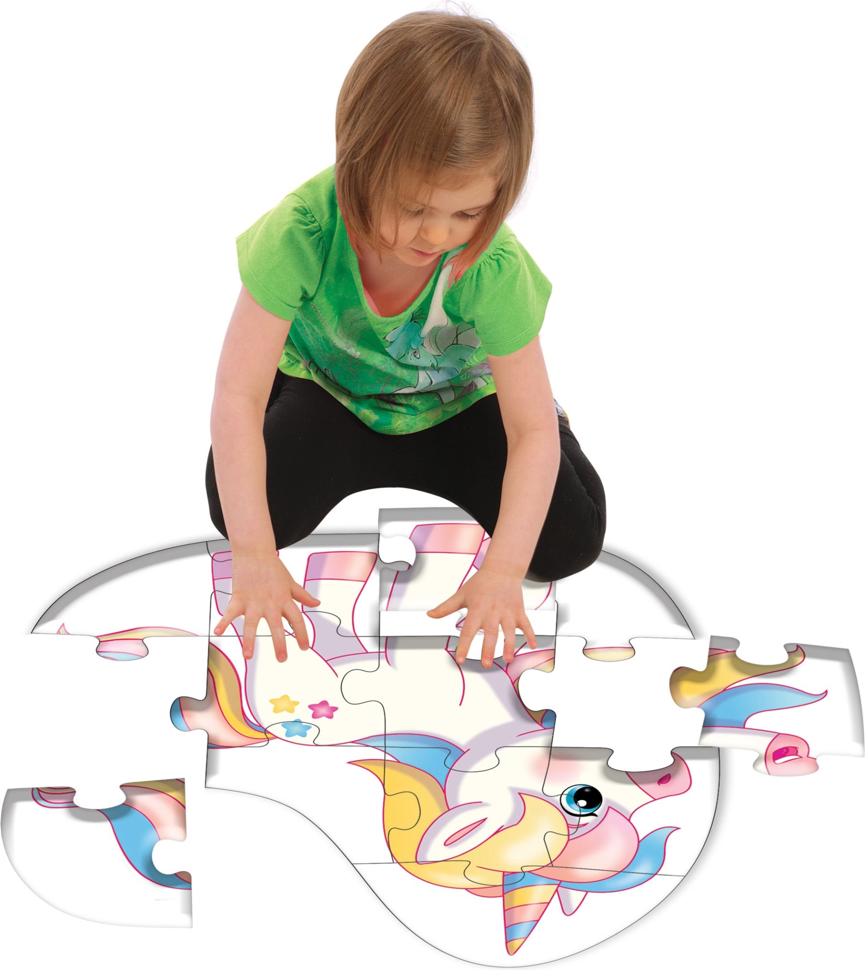 Dette konturpuzzle i form af en enhjørning vil glæde alle små eventyrelskere. Det samlede billede måler cirka 53 × 55 cm, så det er let at se, overskueligt og fantastisk at lægge på gulvet. De større brikker ligger godt i hånden, selv for mindre børn.