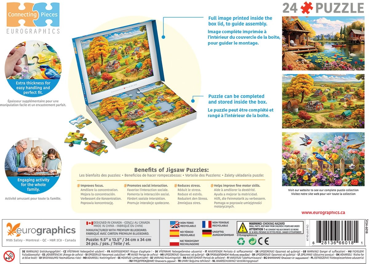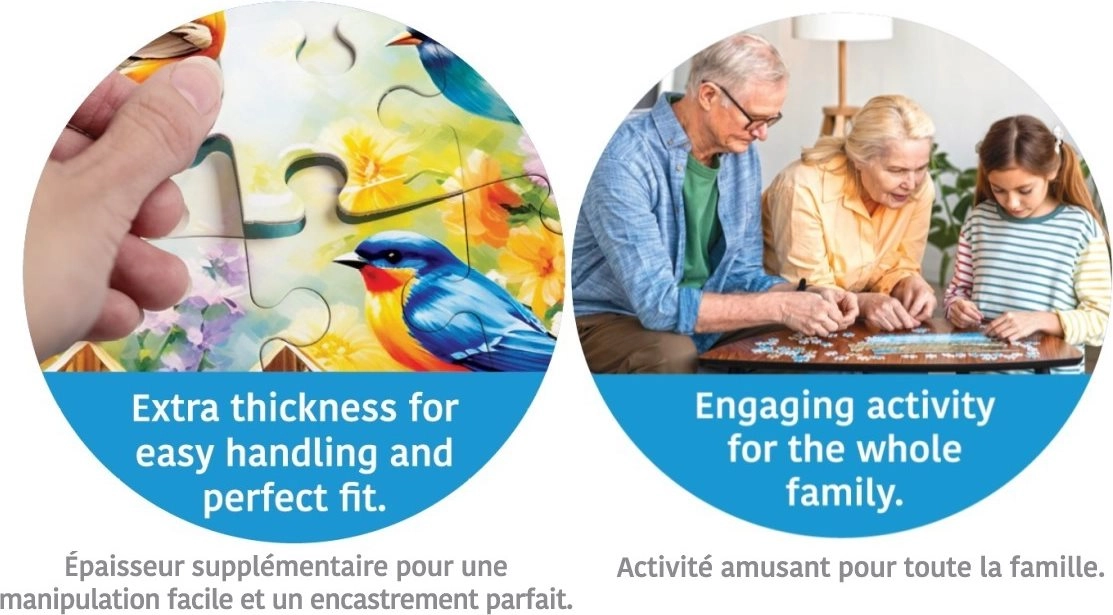 Oplev beroligende puslespilslægning med EUROGRAPHICS Connecting Pieces: Fredfyldt liv. Store brikker og gennemtænkt design understøtter kognitive færdigheder, finmotorik og social interaktion. Ideelt til ældre og personer med begrænset mobilitet eller demens. At lægge puslespillet direkte i æsken gør håndteringen nemmere og giver en behagelig, stressfri oplevelse.