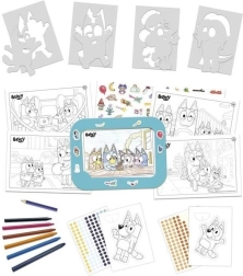 Opdag det sjove kreative sæt Bluey 3-i-1, som tilbyder børn tre aktiviteter i ét: farvelægning af billeder, fremstilling af 3D-figurer og tegning med skabeloner. Understøtter finmotorik, koncentration og fantasifuld leg.