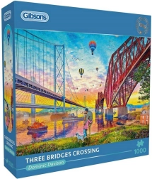 Nyd afslapning med et kvalitetspuslespil fra Gibsons med motivet Tre broer over floden. Æsken indeholder 1000 brikker, og det færdige motiv måler 68 × 49 cm – en ideel størrelse til indramning og udstilling.