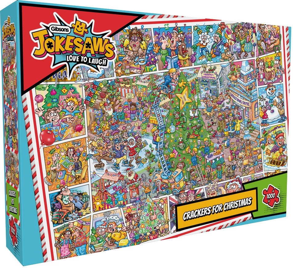 Træd ind i en verden af festlig sjov med puslespillet GIBSONS Jokesaws: Crackers for Christmas. Tusen omhyggeligt udskårne brikker leverer en detaljeret illustration med masser af julejokes, som vil glæde både samlere og lejlighedsvise puslespilsentusiaster. Takket være det behagelige færdige format på 68 × 49 cm passer det perfekt til de fleste borde og underlag.