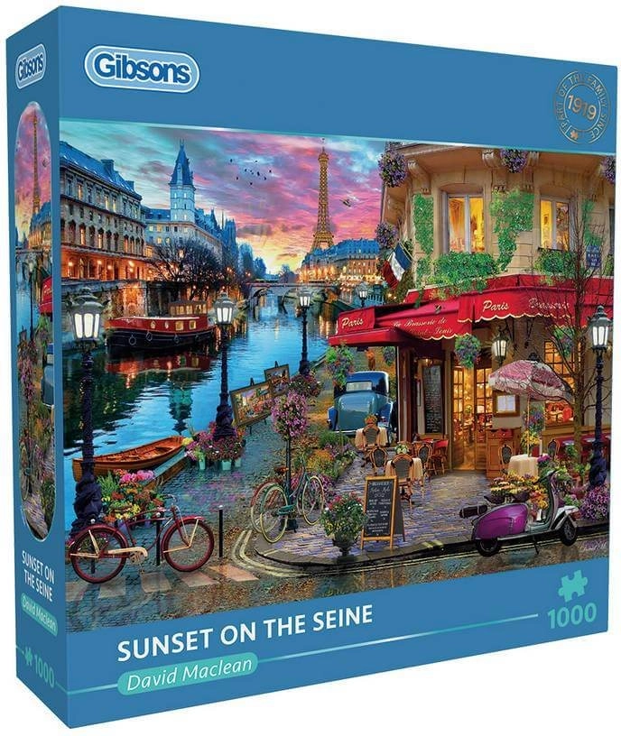 Oplev magien ved en parisisk aftenskumring med scenen af Seinen ved solnedgang. GIBSONS er kendt for høj kvalitet i karton, præcise udstansninger og dybe farver, der fremhæver hver detalje. Samlingen er glidende, behagelig og egnet til både begyndere og erfarne puslespilsentusiaster.
