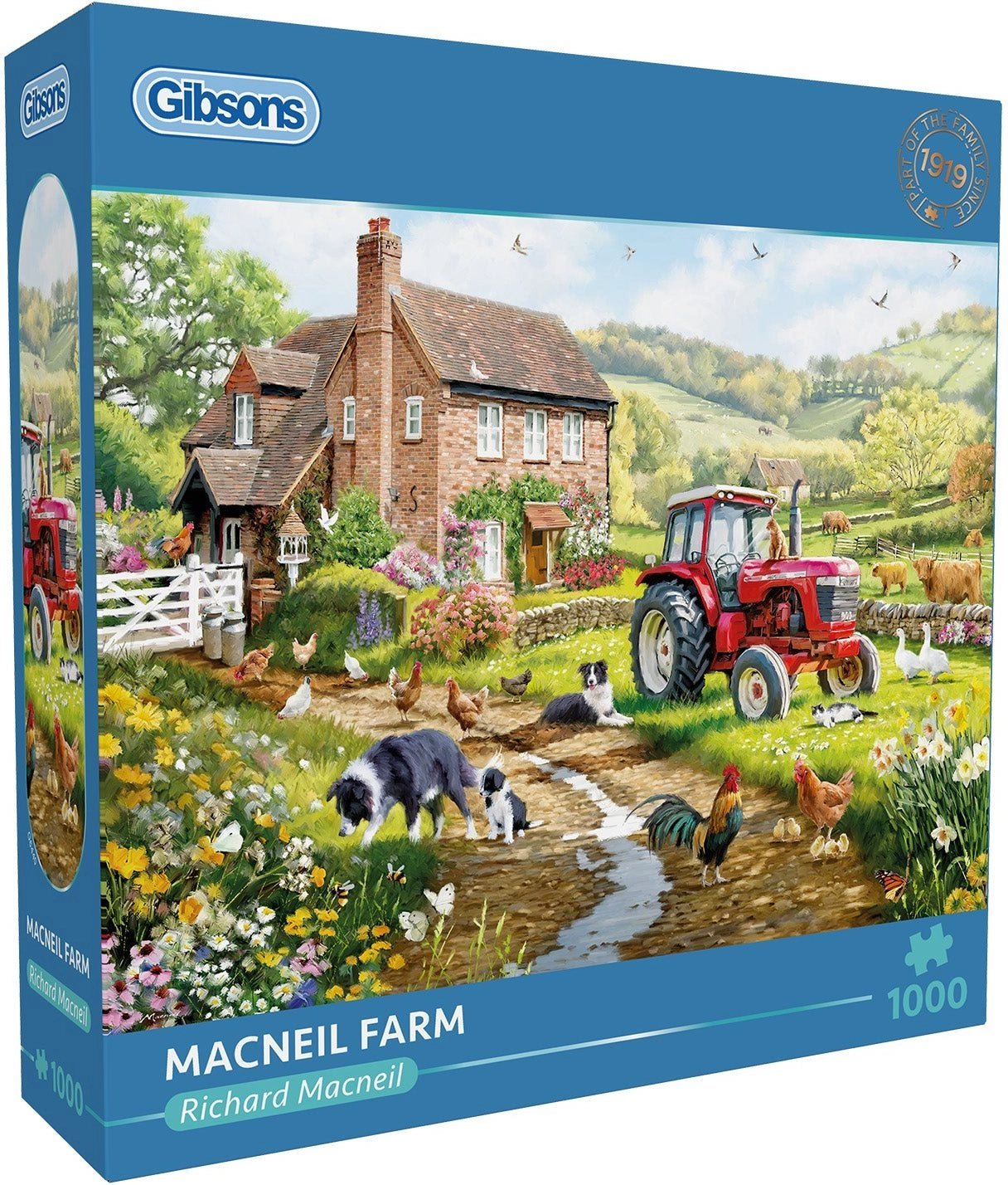 Nyd afslapning og underholdning med et kvalitetspuslespil fra GIBSONS. Illustrationen “Macneils gård” byder på 1000 brikker fulde af detaljer og farver, som vil glæde elskere af landlige motiver. Når det er samlet, måler puslespillet ca. 68 × 49 cm – ideelt til indramning eller udstilling.