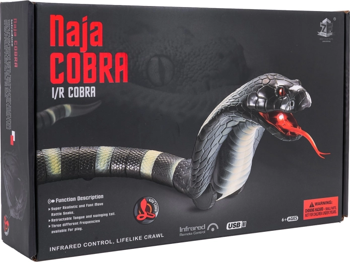 RC-cobraen er en iøjnefaldende legetøjslange, der imponerer med realistisk udseende og bevægelse. Den segmenterede hale (21 dele) giver jævn “bølgegang” og hurtige manøvrer, mens den bevægelige tunge og LED-lys i munden tilfører dramatik til legen. Styring på 2,4 GHz er stabil og let at bruge selv for børn.