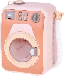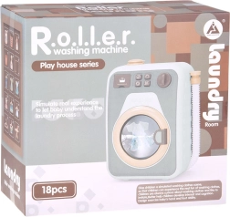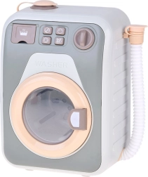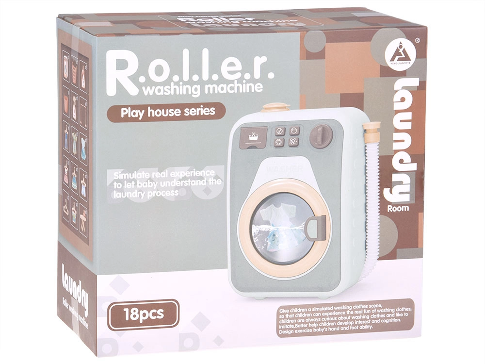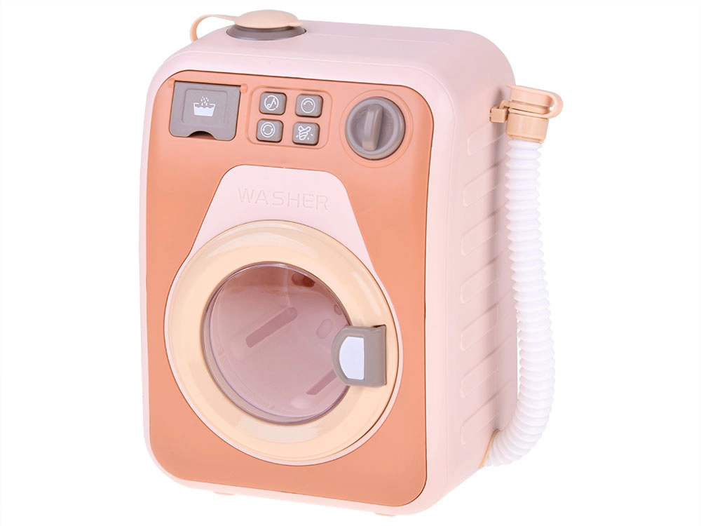 Denne interaktive 2-i-1 vaskemaskine med tørretumbler i attraktive pastelfarver efterligner trofast rigtige husholdningsapparater: den har betjeningspanel, knapper, drejevælger, åbningsbar tromlelåge og beholdere til vaskepulver og vand. Børn kan “vaske” realistisk – fylde tromlen med vand, starte et program og til sidst tappe vandet ud gennem slangen med lukning.