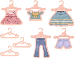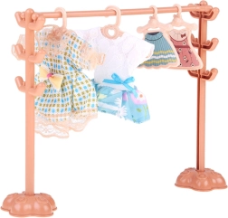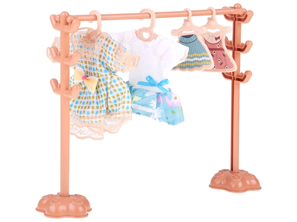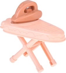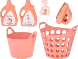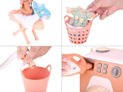 Inkluderer kurve, flasker til “detergenter”, strygejern med bræt, stativ og et sæt bøjler samt tøj til dukker – alt til vask, tørring, ophængning og strygning.