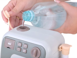 Vand kan hældes i maskinen via den øverste påfyldningsåbning og efter “vask” nemt tappes ud gennem en slange med håndtag og prop. Børn kan dermed prøve hele vaskeprogrammet – næsten som i virkeligheden.