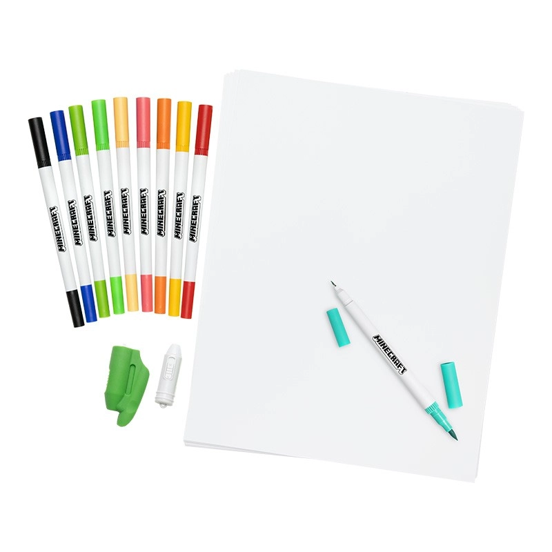 Sættet indeholder lette, dobbeltsidede markere med både fin og bred spids til præcise linjer og jævn skygning. Ideelt til skitser, optegning og farvelægning af Minecraft-motiver.
