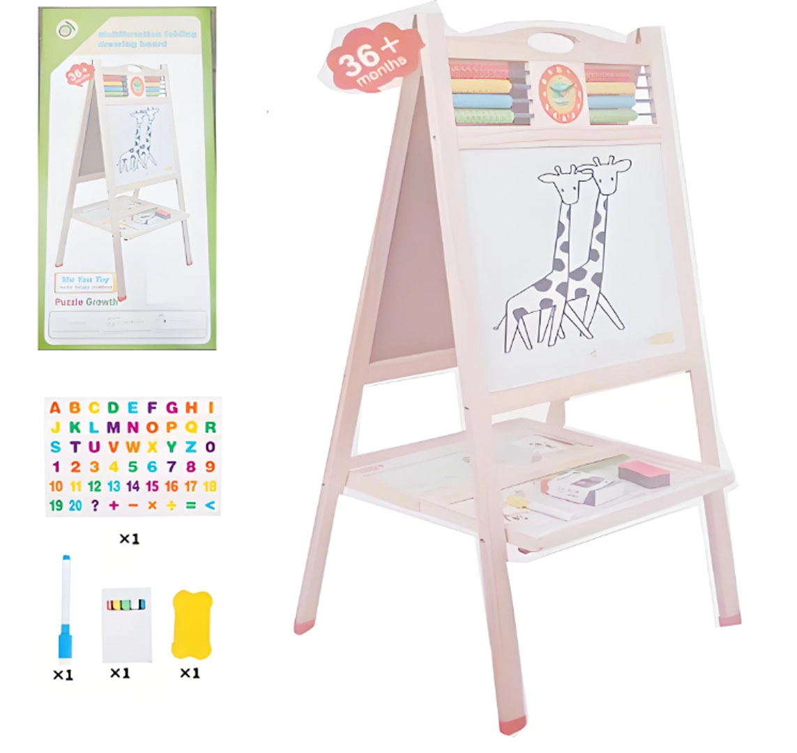 Stor trætavle til børn fra 3 år med på den ene side en magnetisk hvid overflade til tusch og på den anden en kridttavle. Øverst findes en kugleramme og urskive med bevægelige visere. Inkluderer magnetiske bogstaver og tal, tusch med visker, kridt og svamp – alt til sjov læring, udvikling af finmotorik, koncentration og fantasi.