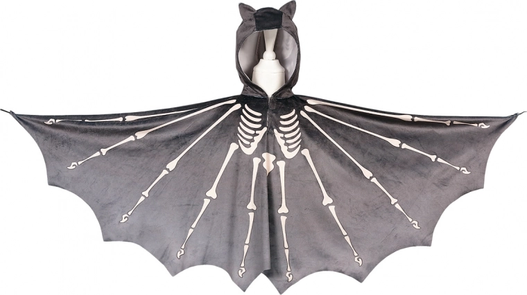 Dette originale flagermuskostume er et fantastisk valg til børn, der elsker fantasi og udklædning. Den lette kappe med hætte giver komfort og bevægelsesfrihed, mens det realistiske print af skelet og vinger giver kostumet et markant udtryk. Takket være den nemme velcrolukning kan børnene klæde sig på selv.