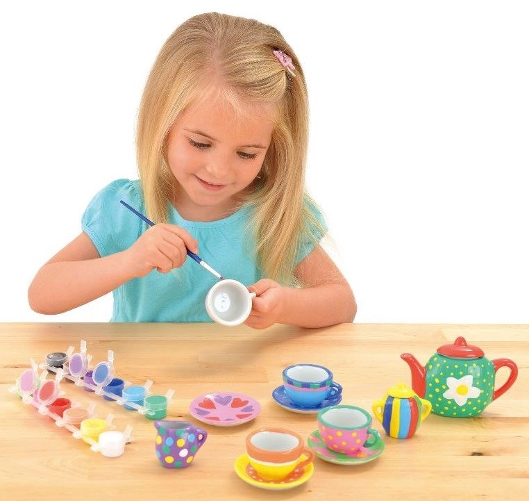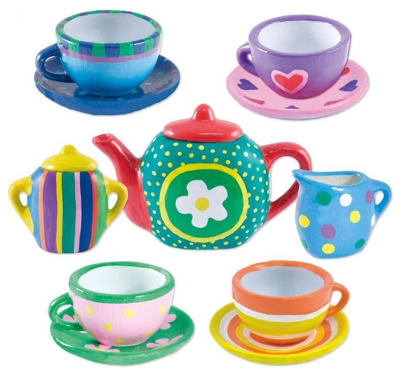 Sættet inkluderer tekande, 4 kopper med underkopper, sukkerskål og mælkekande – ideelt til kreativ udsmykning og efterfølgende leg med femte-te.