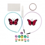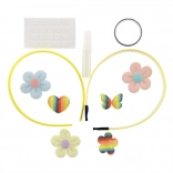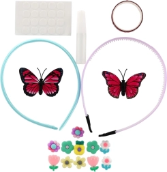 - 2 plast-hårbøjler, mix af dekorationer (applikation sommerfugl, hjerte, blomst, små sten), selvklæbende prikker, lille lim; nogle sæt kan indeholde bånd/snor eller ring
