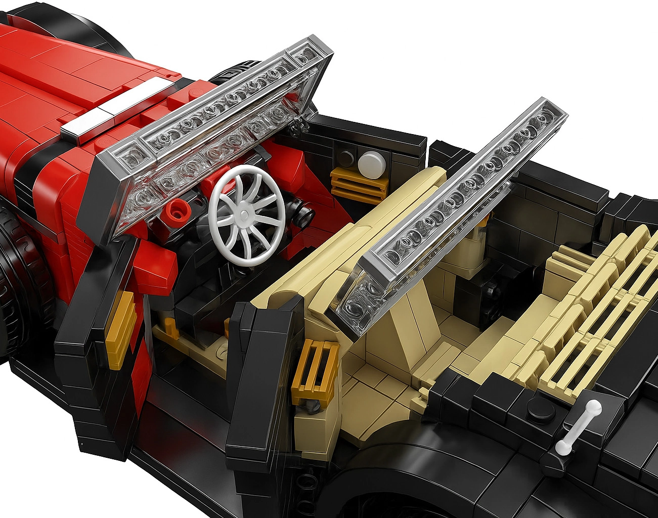 Takket være det aftagelige tag kan du nemt forvandle coupéen til en cabriolet, og åbnebare døre samt motorhjelm afslører flere realistiske detaljer. Gummidæk, markante skærme og lygter understreger det autentiske look. Byggesættet passer til større børn og voksne, som sætter pris på kombinationen af byggeglæde og den dekorative værdi af den færdige model.