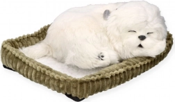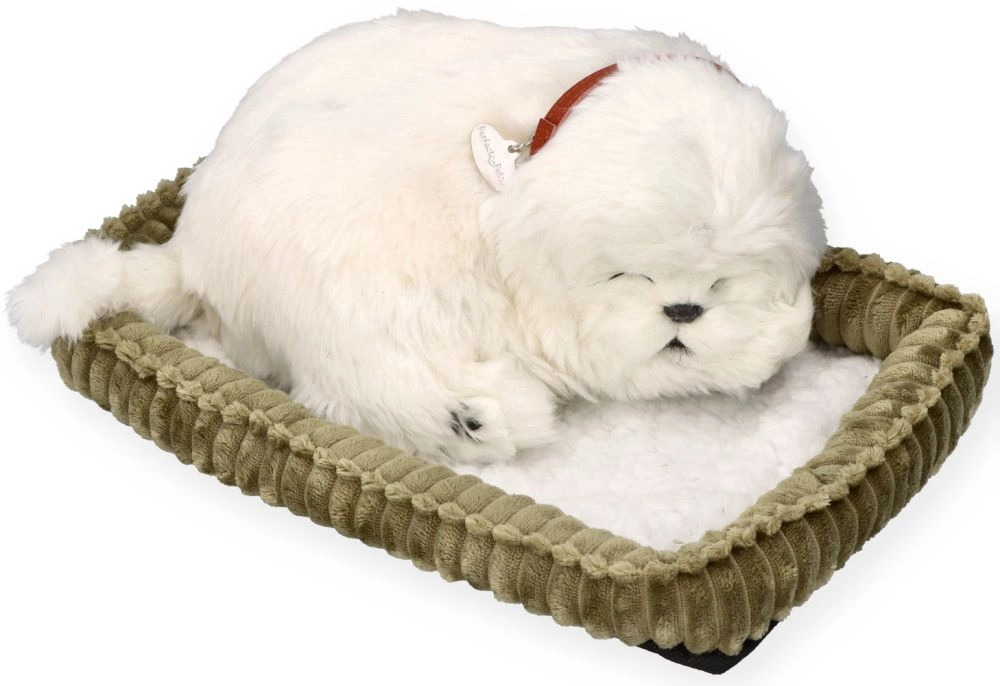 Den sovende malteserhvalp i den bløde seng virker overraskende livagtig. Den bløde plyspels, de fine detaljer og den naturlige stilling skaber en behagelig, beroligende stemning på børneværelset og i stuen. Et godt valg for små dyrevenner, som vil have glæde af en “hund” uden bekymringer.