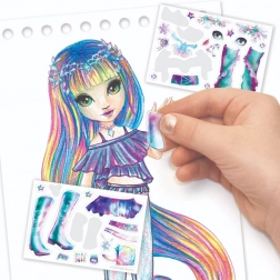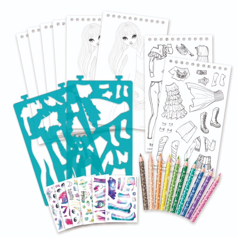 Sættet indeholder 20 fortrykte sider med figur, 2 sider med skabeloner med 28 beklædningsdele, 6 ark klistermærker (100 stk.), 10 farveblyanter og en billedvejledning. Børn kan tegne tøj op med skabelonerne, farvelægge og dekorere med klistermærker for unikke modekombinationer.