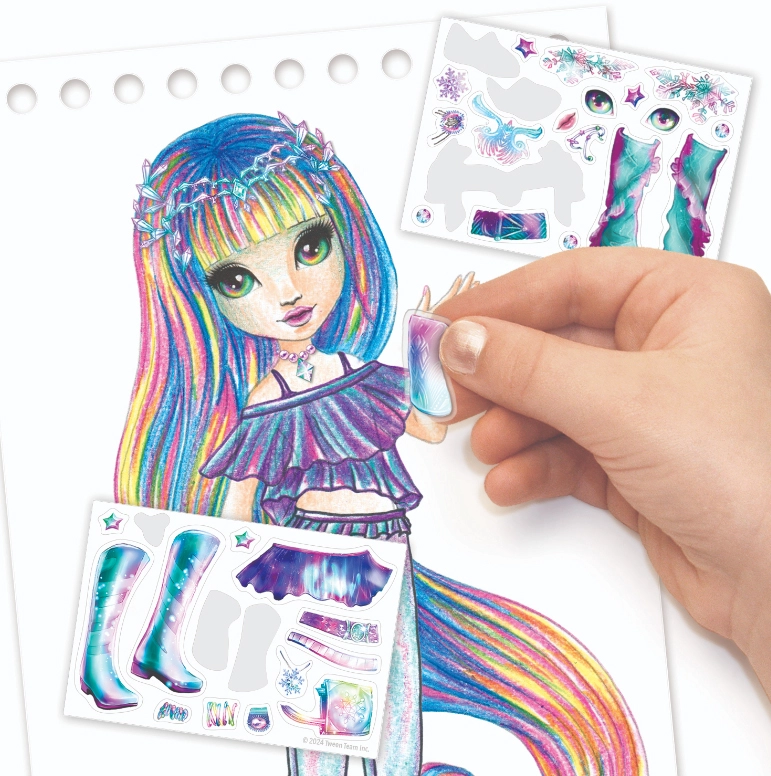 Indeholder 2 sider med skabeloner (28 dele), 10 farveblyanter og 6 ark klistermærker. Design, farvelæg og finpuds modestile trin for trin.