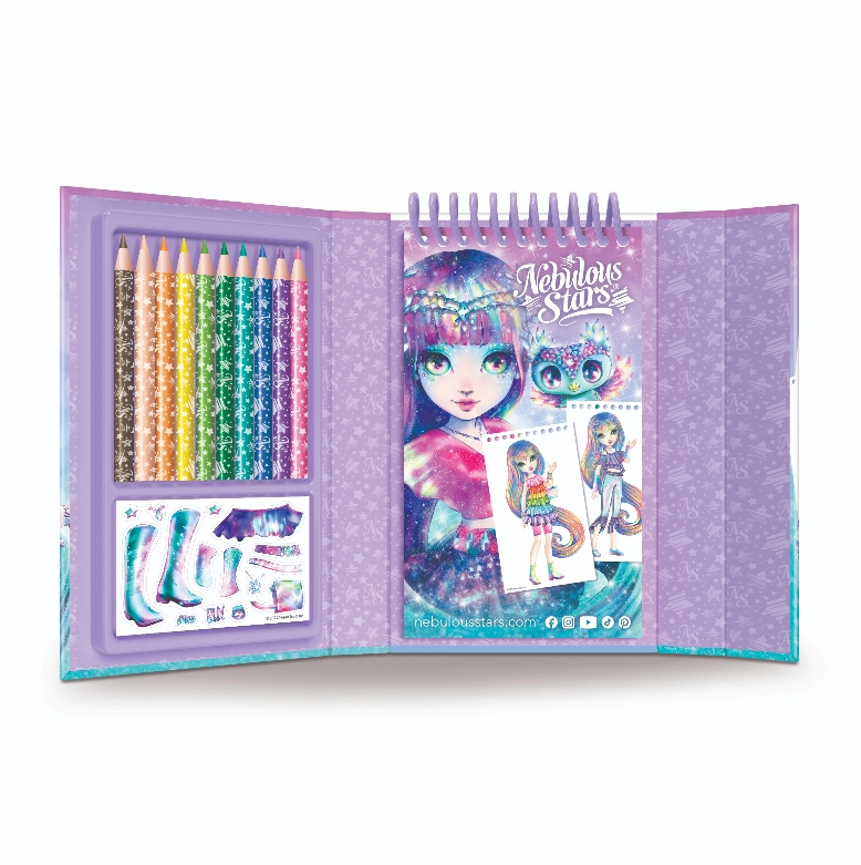 Opdag en kreativ verden med det kompakte Nebulous Stars-sæt, ideelt til rejsen. Denne praktiske blok med magnetlukning indeholder 20 sider med figur, skabeloner til tøjdesign, 6 ark klistermærker, 10 farveblyanter og en billedvejledning – alt hvad børn behøver til fantasi, mode og tegning hvor som helst.