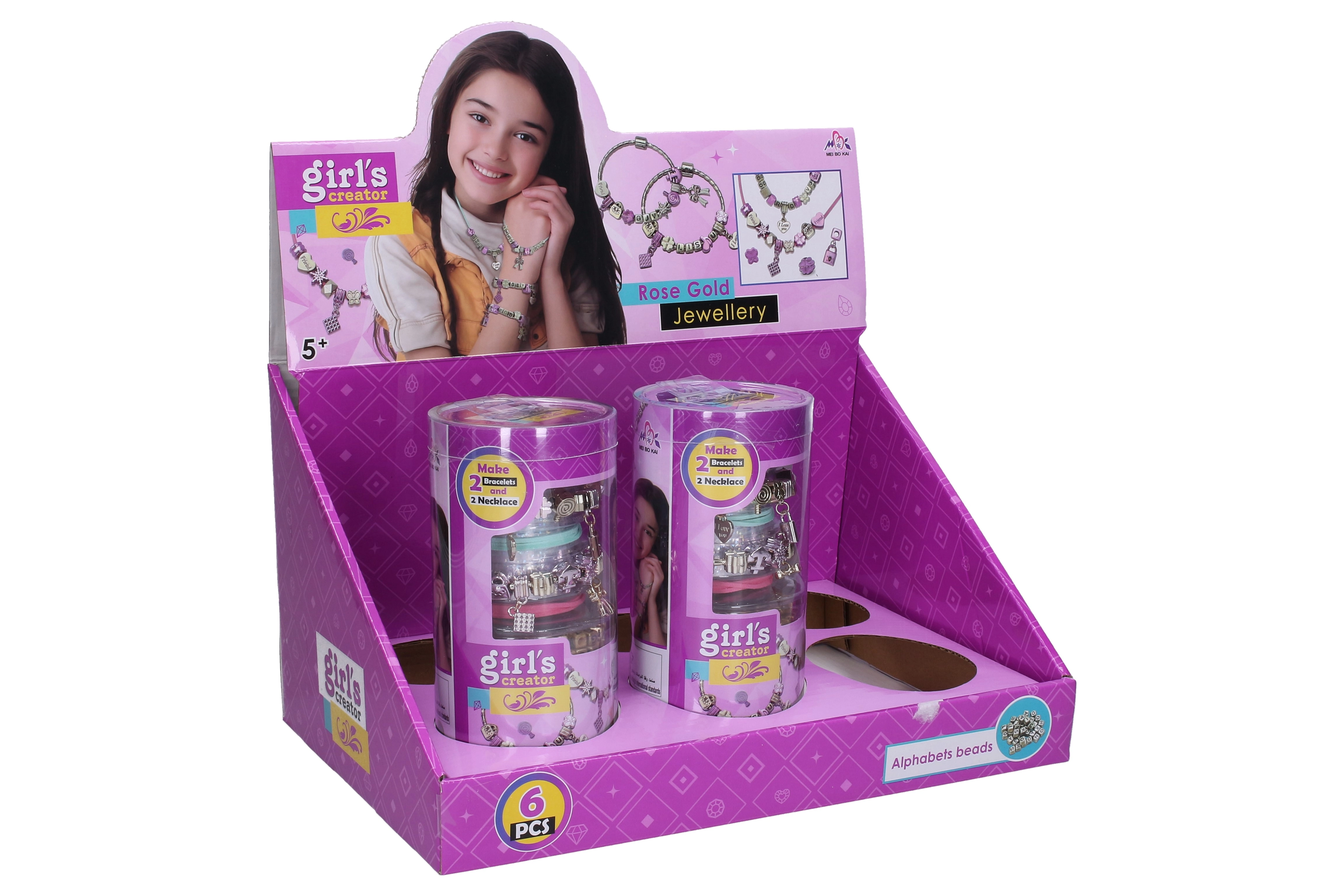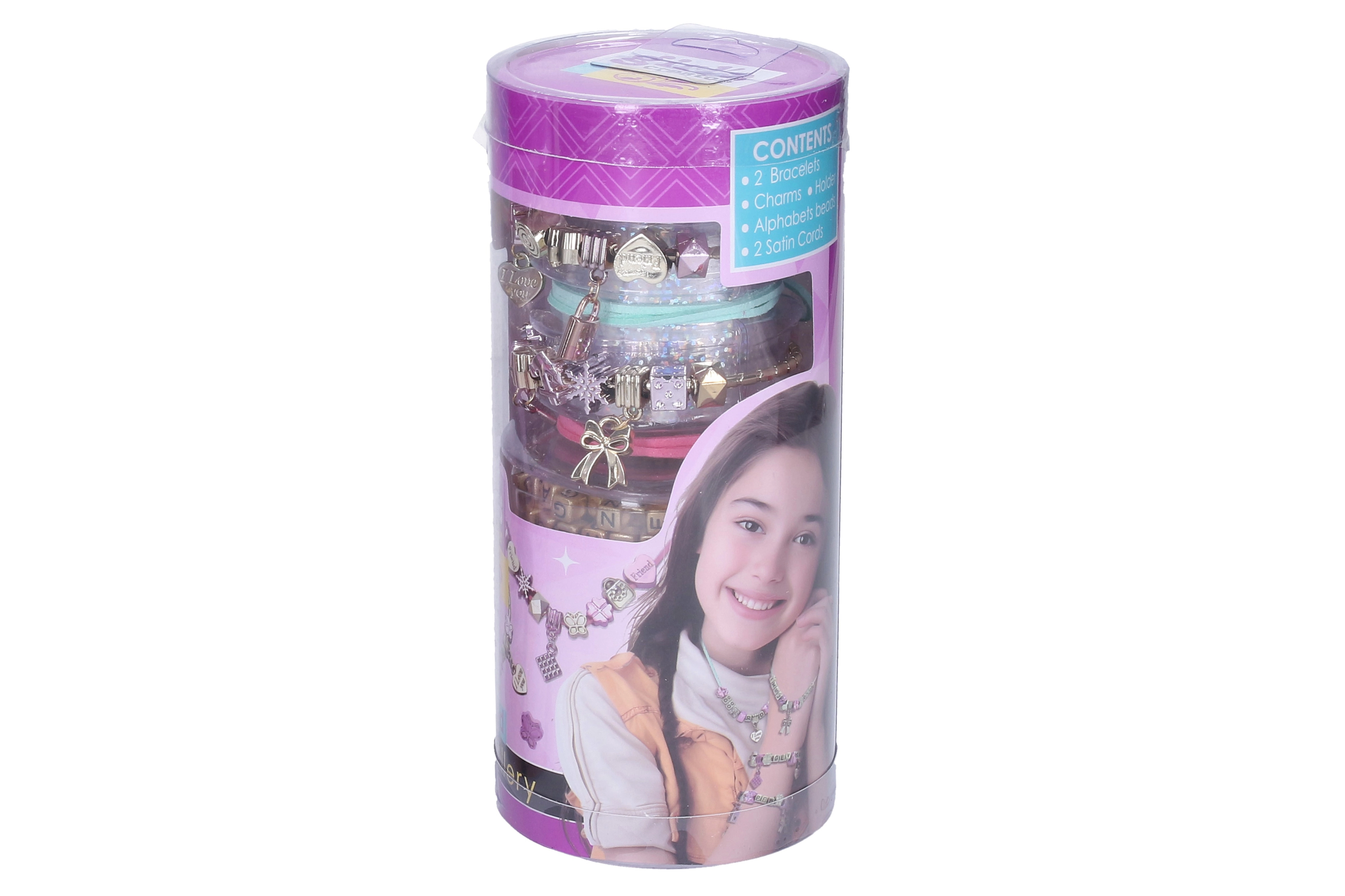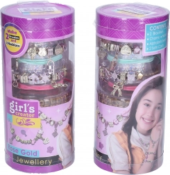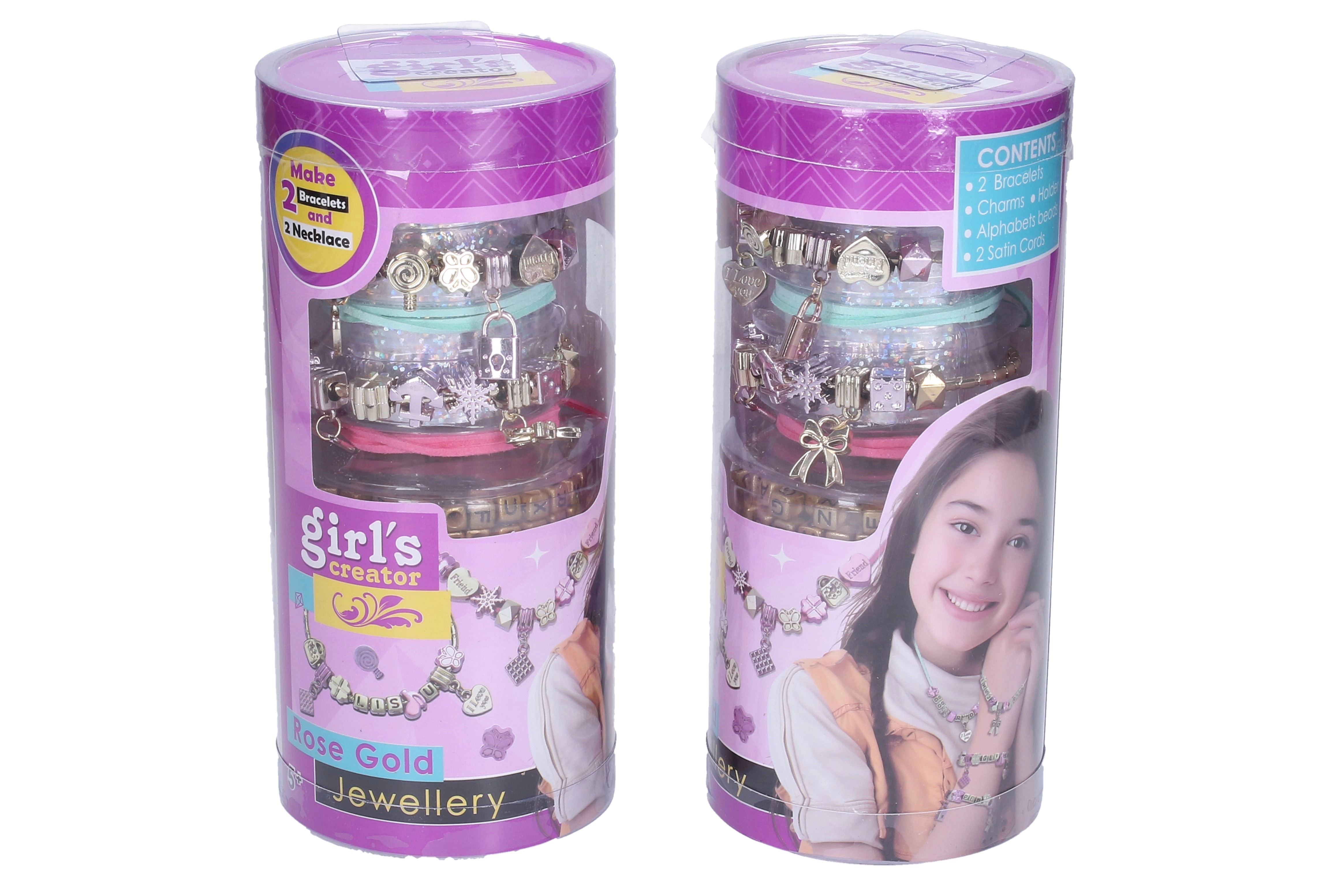 Dette kreative sæt vil glæde alle små smykkedesignere. I pakken finder du alt, der skal bruges til at lave stilfulde armbånd og halskæder i en elegant rosaguld-tone – fra vedhæng formet som hjerter, stjerner og sløjfer til bogstavperler til navne og beskeder.