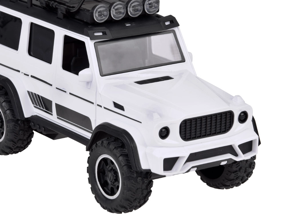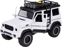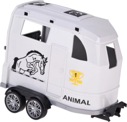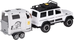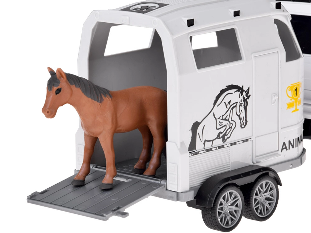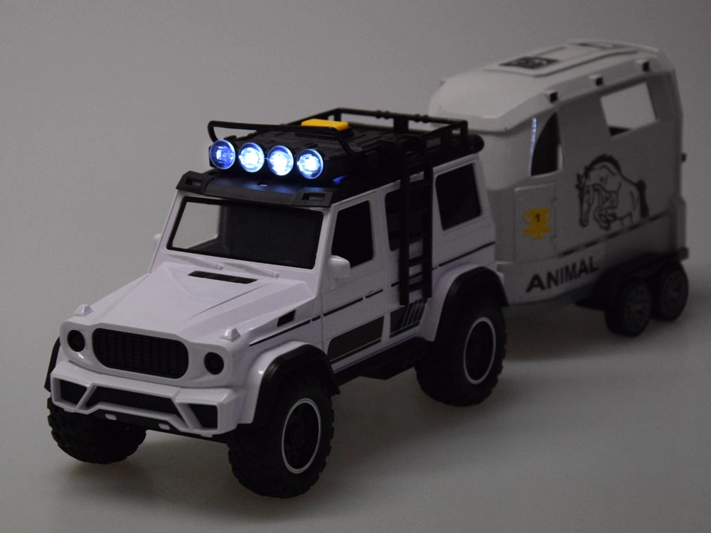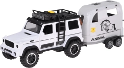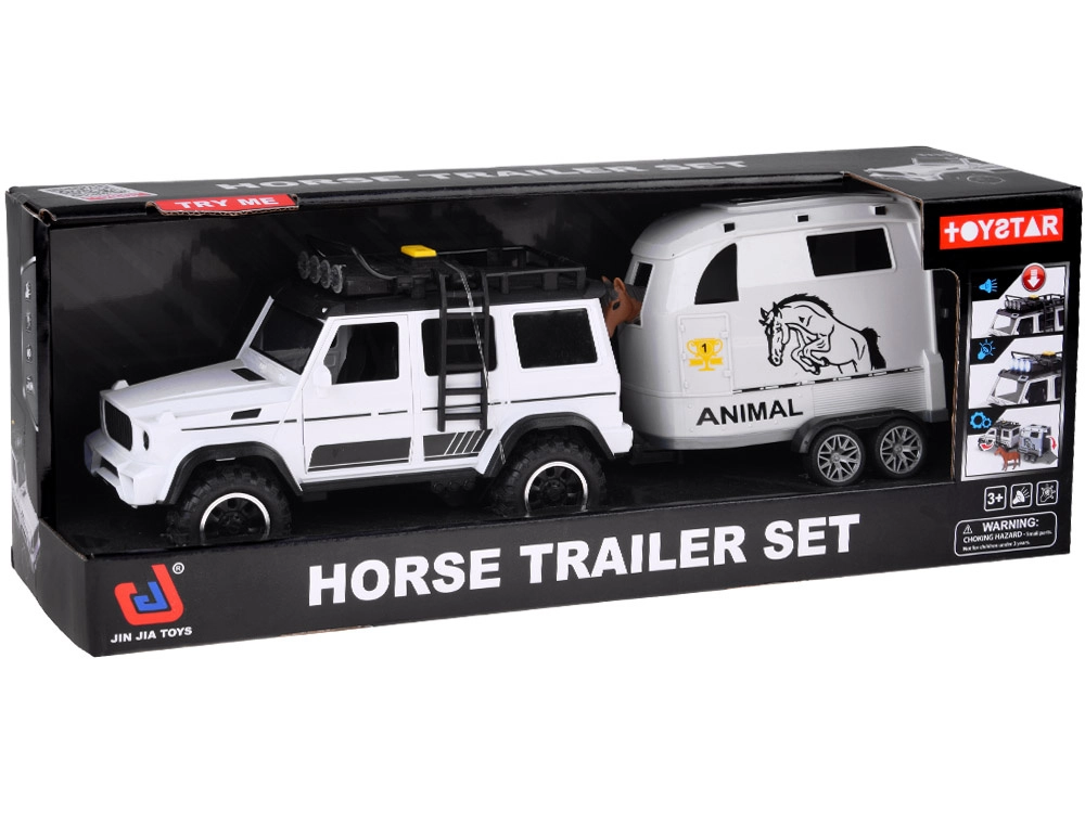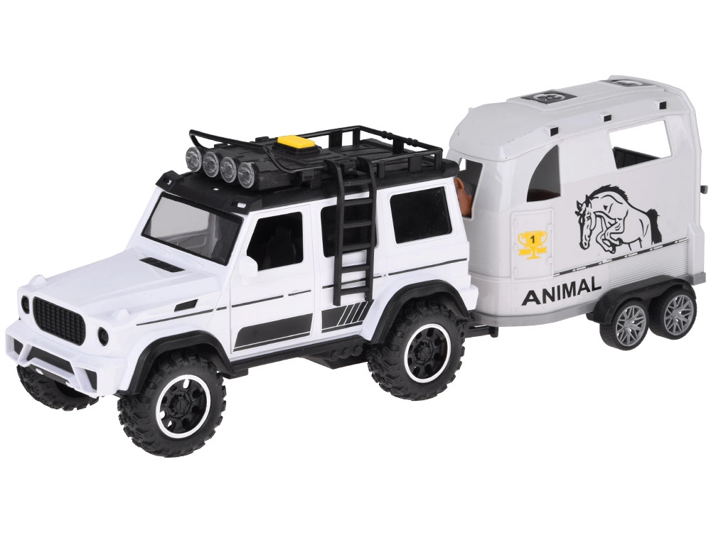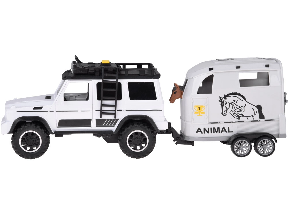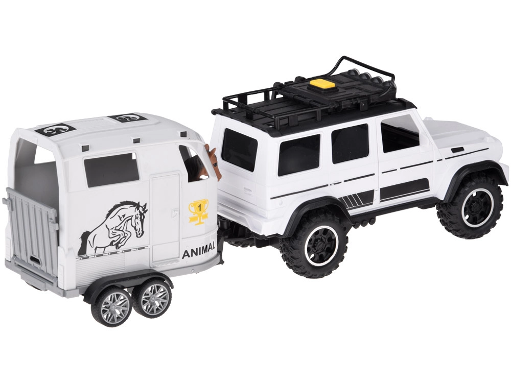 Opdag et sjovt sæt til små bil- og dyreelskere: en hvid terrængående bil med aftagelig hestetrailer og en hestefigur. Køretøjet har åbningsbare døre, gummihjul, lys- og lydeffekter og anhængertræk. Traileren byder på en nedfældelig bagrampe og jævnt rullende hjul for realistisk leg.