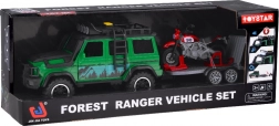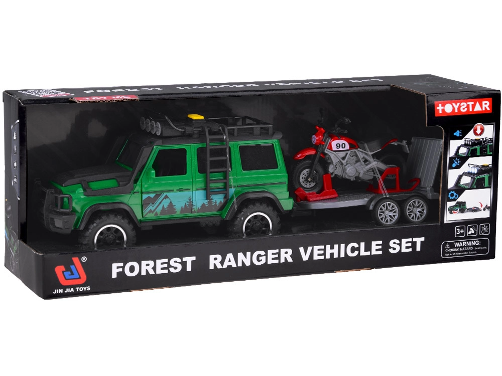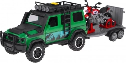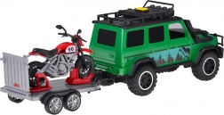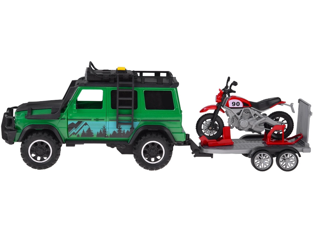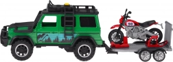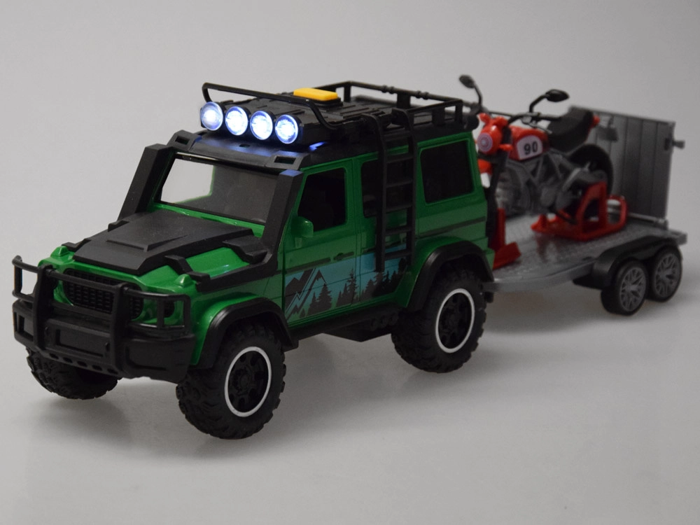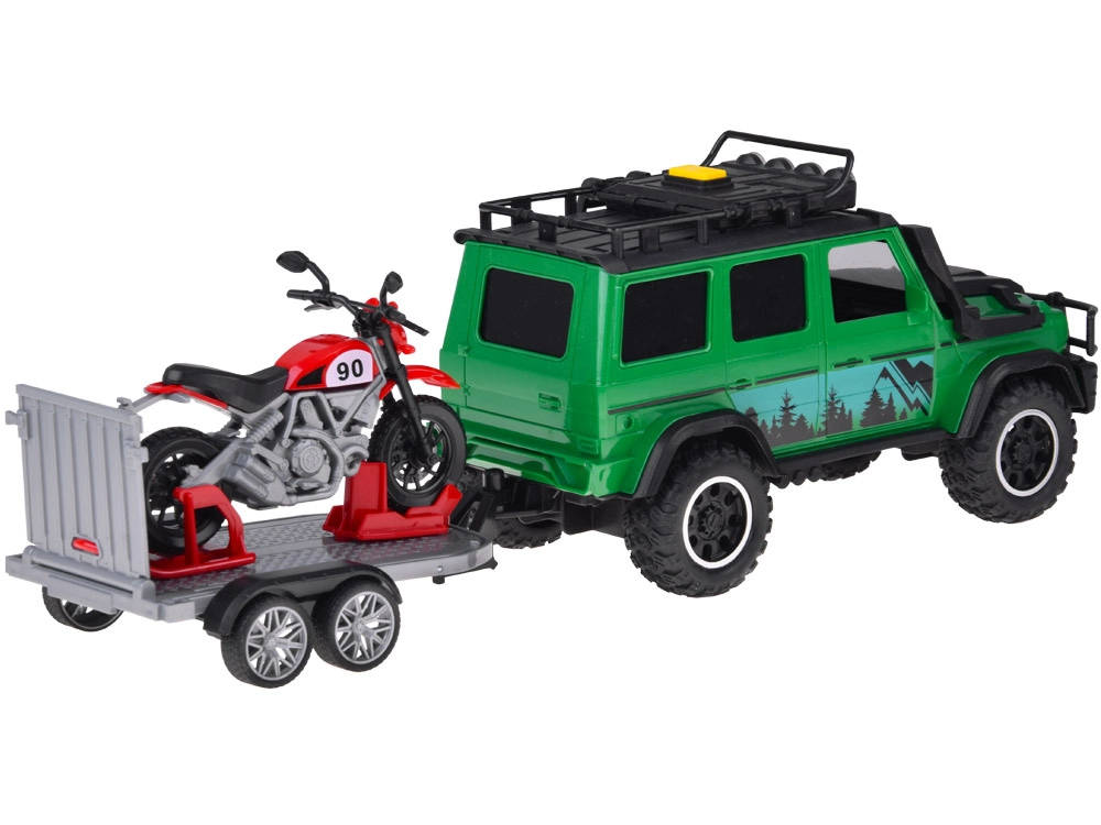 Eventyrsæt til små chauffører: grøn terrængbil med aftagelig trailer–lad og rød sportsmotorcykel. Bilen byder på lys- og lydeffekter, åbningsbare døre og gummihjul for jævn kørsel. Traileren har en nedfældelig bagrampe for nem pålæsning og sikker transport af motorcyklen. Ideel til kreativ leg og transport af andre yndlingslegetøj.