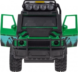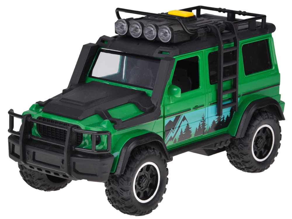 Kør ud i terrænet! Dette detaljerede sæt kombinerer en grøn SUV med robuste dæk og tagbøjle med en praktisk trailer til transport af motorcyklen. Realistisk lys og lyd øger stemningen, mens åbningsbare fordøre og roterende gummihjul giver masser af sjov og jævn bevægelse på gulvet.