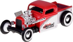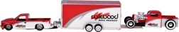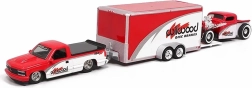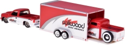 Stilfuldt samlersæt i skala 1:64 med den ikoniske CHEVROLET 454 SS Pick-up 1993 og klassikeren CHEVROLET Pick-up 1936 på en transporttrailer. Modellerne i rød-hvid udførelse har metal-karrosseri, gummihjul for jævn kørsel og detaljerede prints. 454 SS-pickuppen er udstyret med en aftagelig trækkrog, traileren kan nemt kobles til og fra – ideel til leg og udstilling.