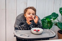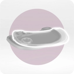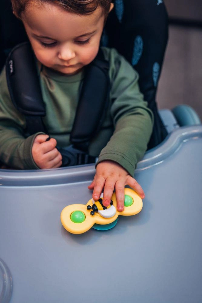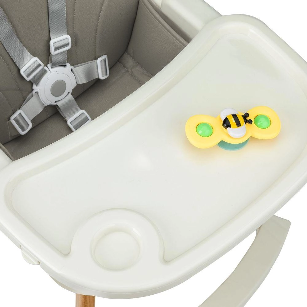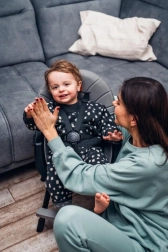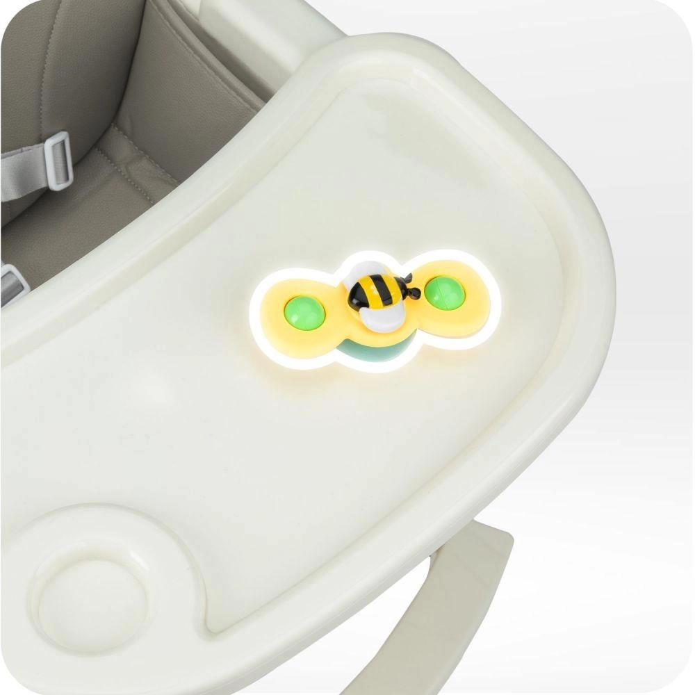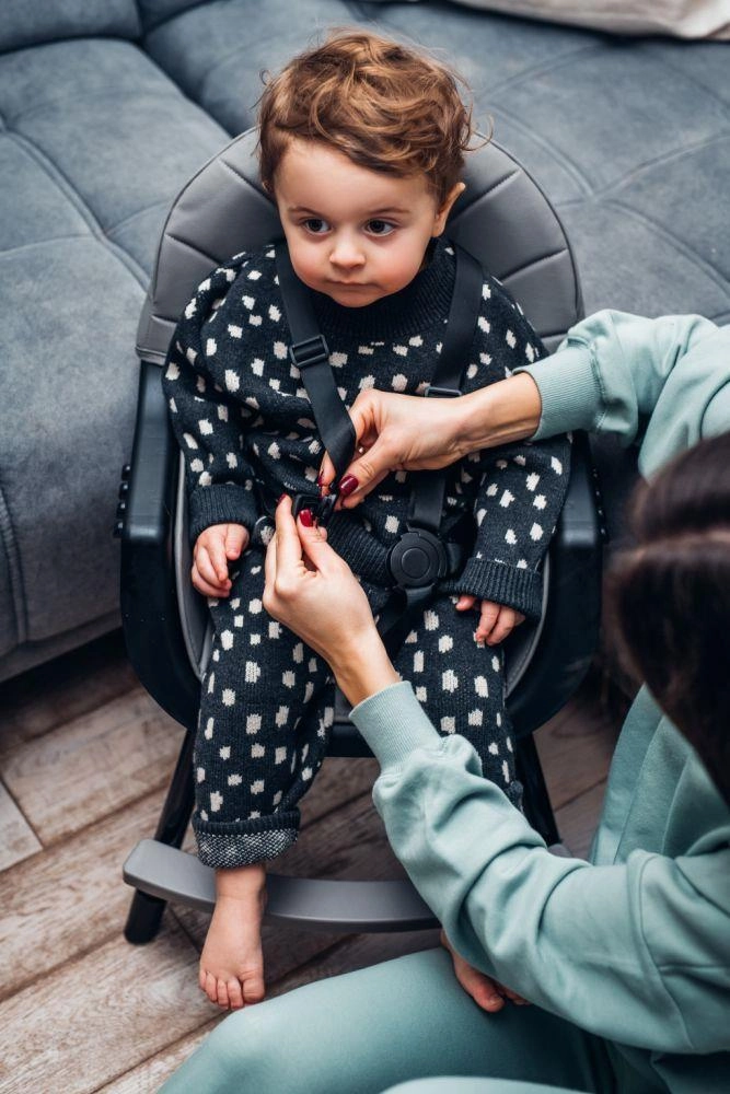 Praktiske detaljer gør hverdagen lettere: økolæder tørres hurtigt af, den øverste del af bakken kan komme i opvaskemaskinen, og den justerbare bakke tilpasses barnet. Den stabile konstruktion med fodstøtte og sikkerhedsseler giver både komfort og tryghed.