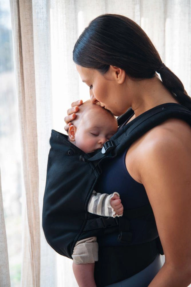 Bær barnet foran fra ca. 3 måneder og på ryggen fra cirka 12 måneder. Aftagelig hætte, lomme og elastikker på stroppenderne gør daglig brug nemmere.