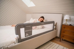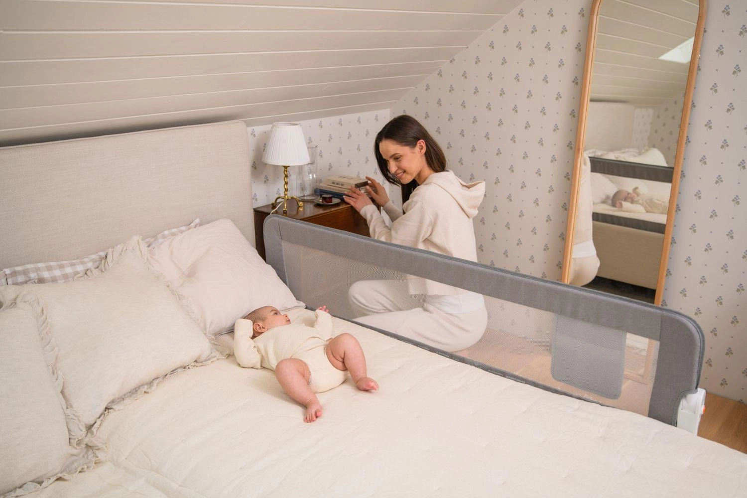 MoMi LEXI PLUS er et pålideligt sengeværn, der beskytter børn mod at glide ud af sengen under søvn. Konstruktionen med blød polstring og afrundede elementer er børnevenlig og sikker til daglig brug. Det brede panel af net sikrer luftgennemstrømning og gør det nemt for forældre at se barnet.