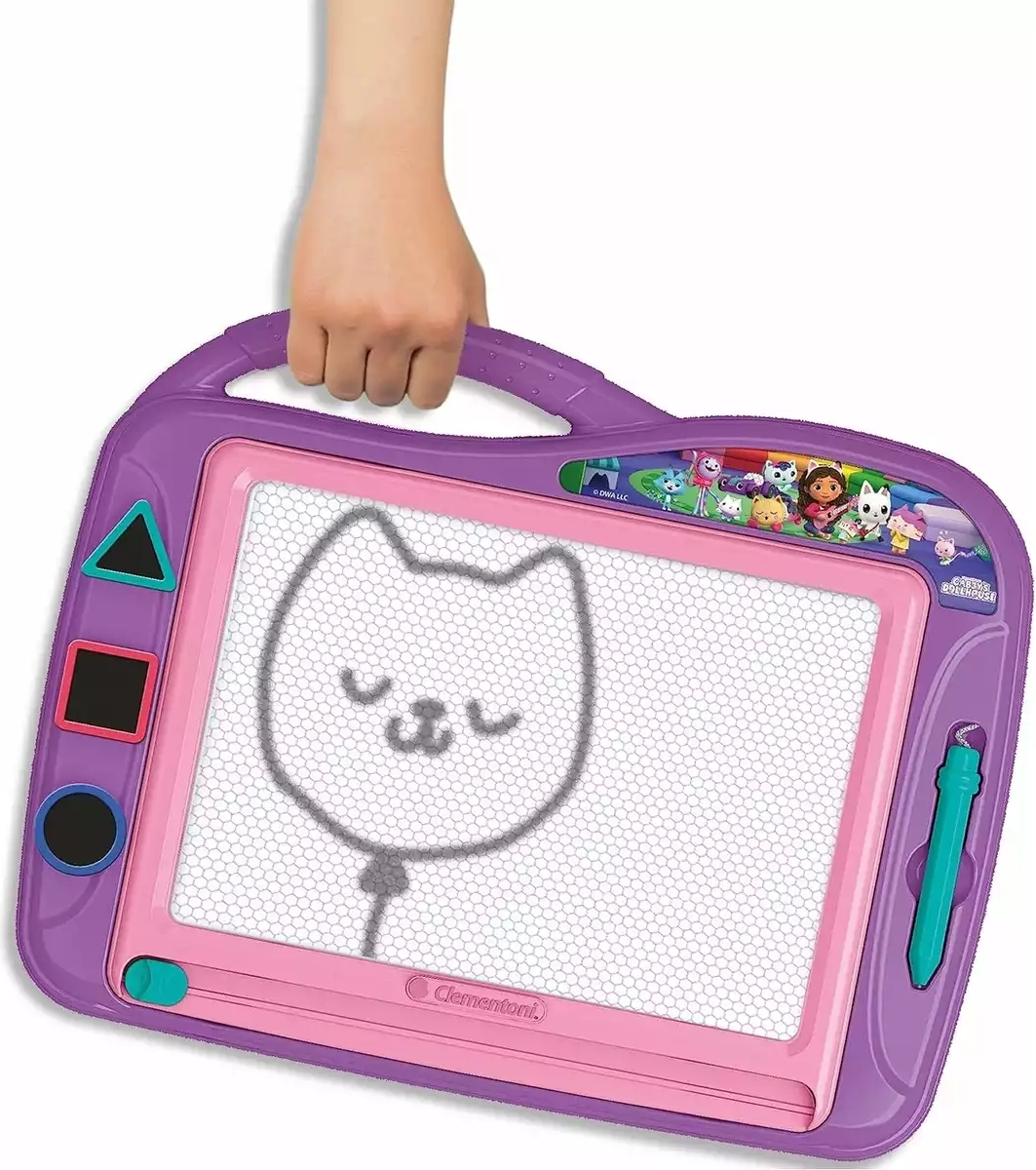 Opdag sjov og rodetfri kreativitet med den magnetiske tavle fra CLEMENTONI med motiv fra eventyret Gabbys magiske hus. Børn kan tegne, stemple og slette alt med ét strøg, så legen aldrig stopper. Tavlen har et praktisk håndtag, 3 magnetiske stempler og en skydeslettegummi for nem sletning – ideel både hjemme og på farten.