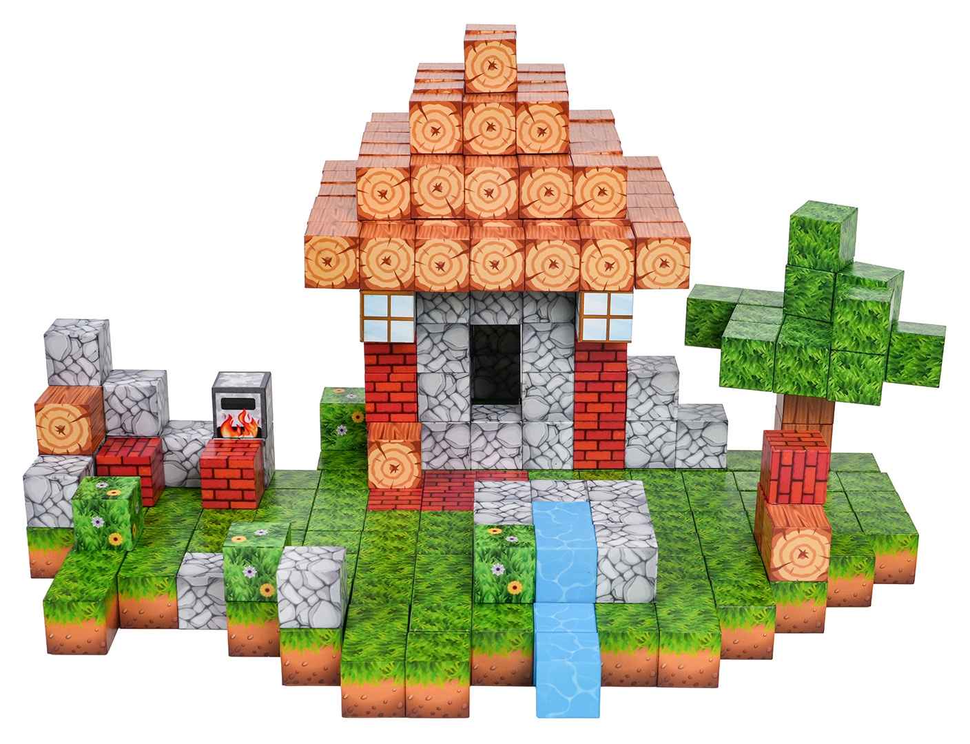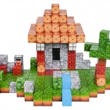 Det store antal klodser med forskellige tryk gør det muligt at samle varierede scener – fra et lille hus med have til en bæk og et pixeleret landskab.