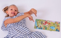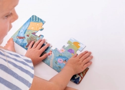 Ekstra store puslespilsbrikker af 2 mm FSC-karton er lette at holde, nemme at samle og holder til daglig leg – uden plastik.