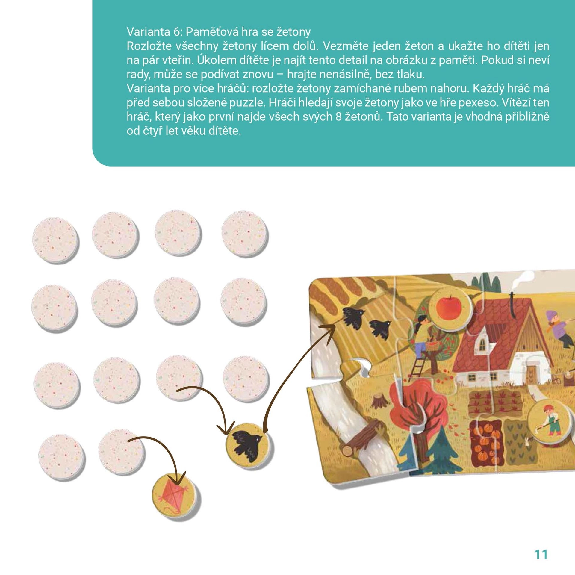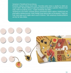 Børn opdager selvstændigt, sorterer og matcher jetoner til de færdige billeder. De udvikler iagttagelsesevne, logisk tænkning og ordforråd.
