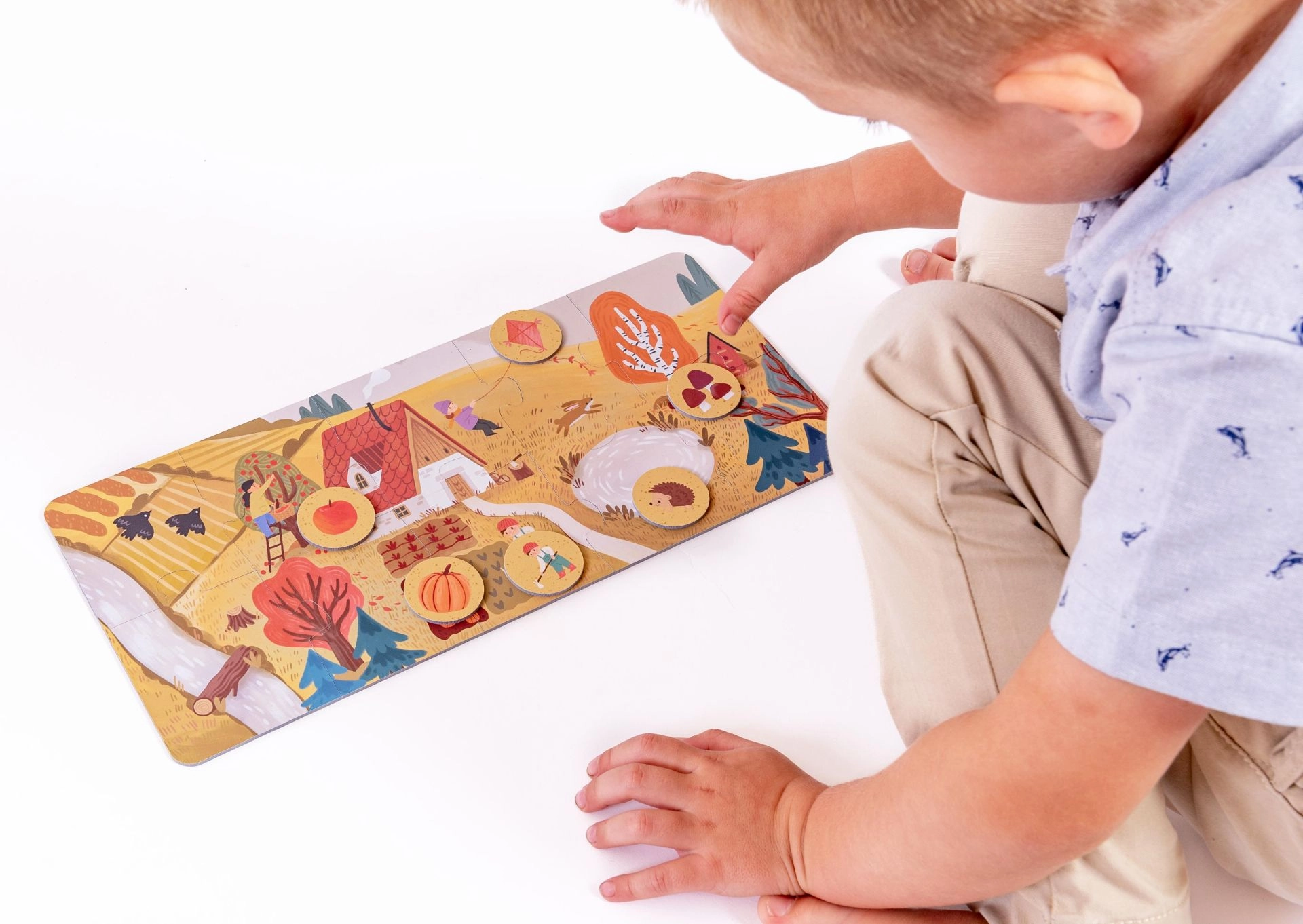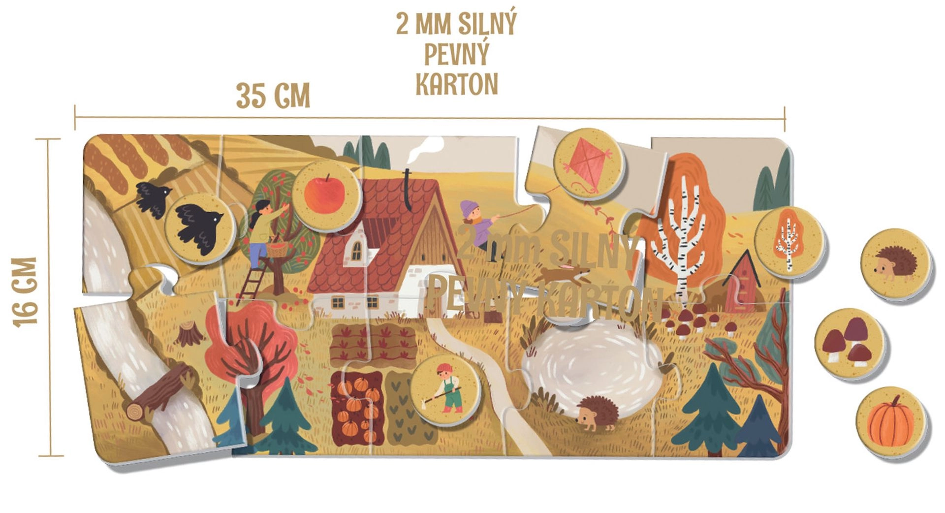 Spillet er designet til små hænder: ekstra store brikker af 2 mm FSC-karton er holdbare, lette at gribe og helt uden plastik. Læringen sker naturligt – børn træner opmærksomhed, udvider ordforråd og taler om årets skiften i naturen.