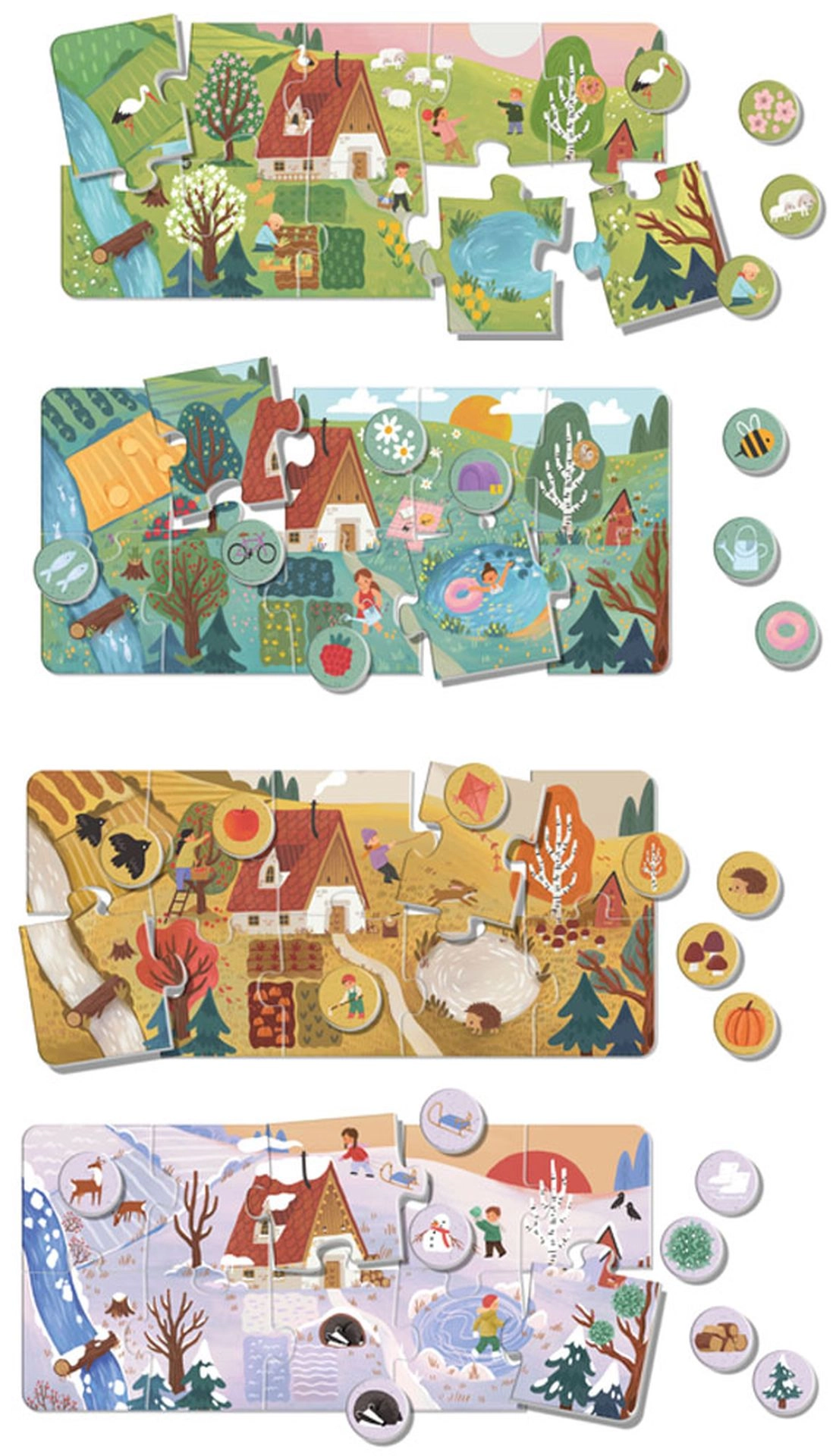 Det store puslespil loto årstider KukiKuk bringer børn fire smukke scener – forår, sommer, efterår og vinter. Hver årstid samles af 10 store brikker, og derefter matcher børnene 8 runde jetoner med typiske motiver. Med Montessori-principper opdager, sorterer og forbinder børn elementer ud fra sanseindtryk.