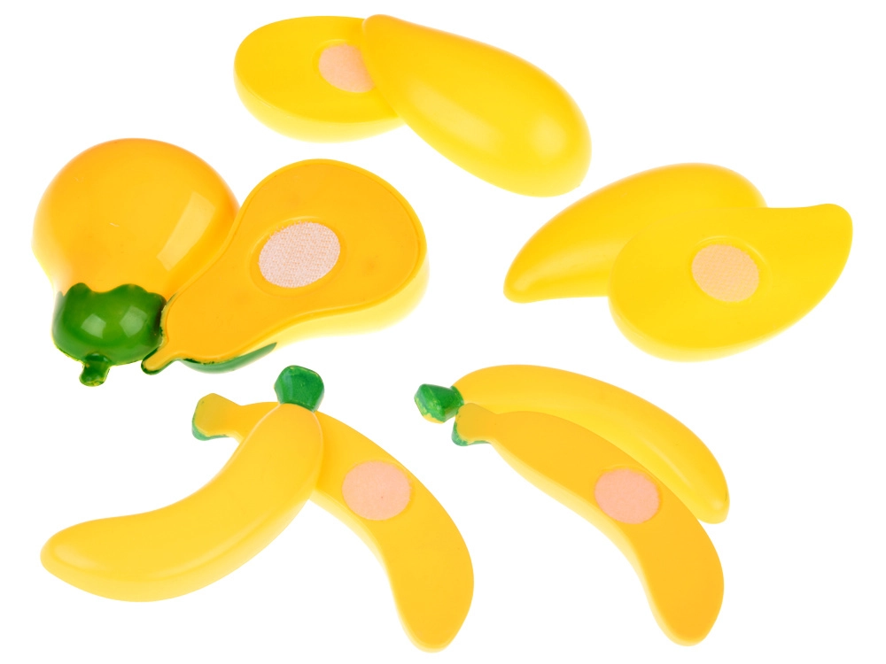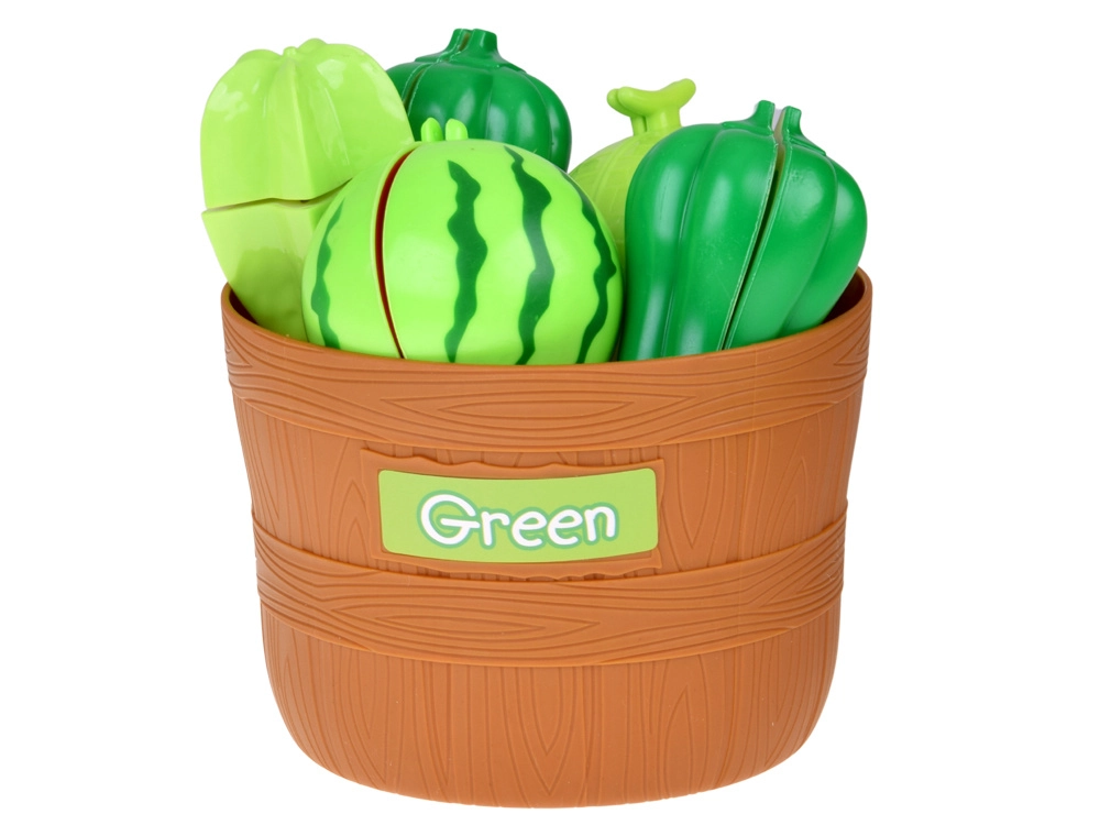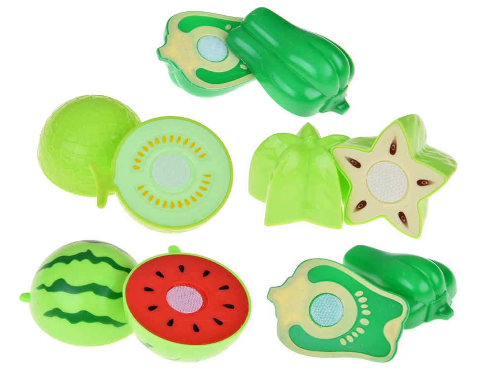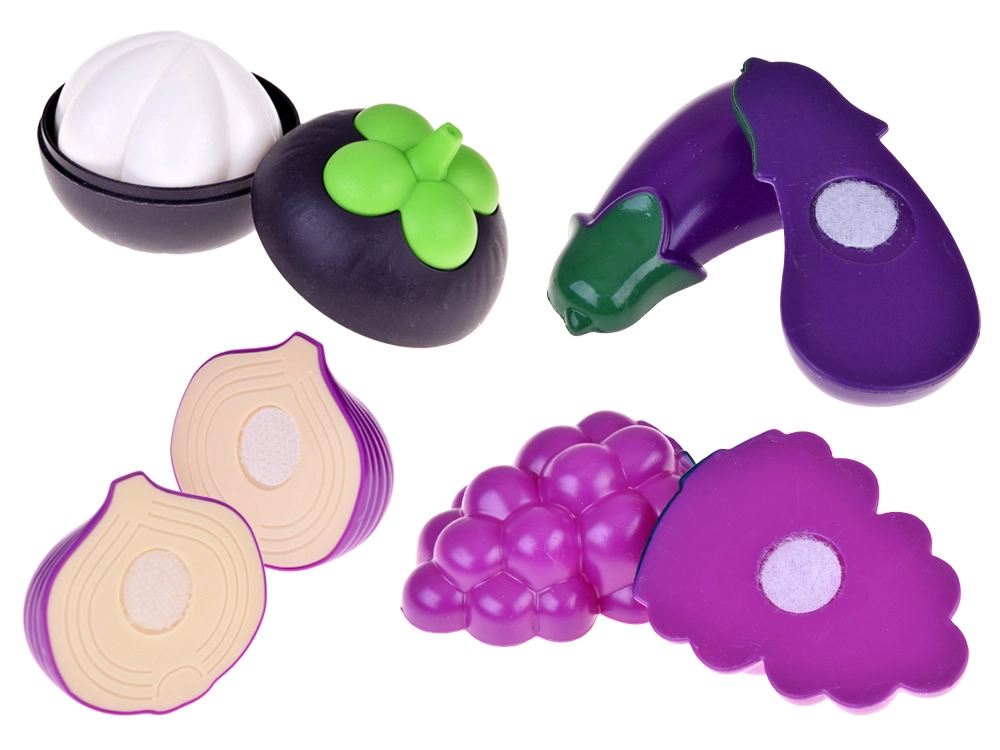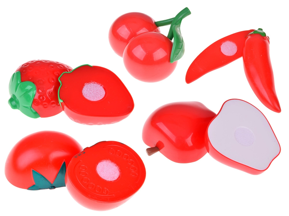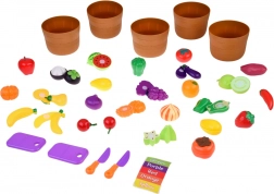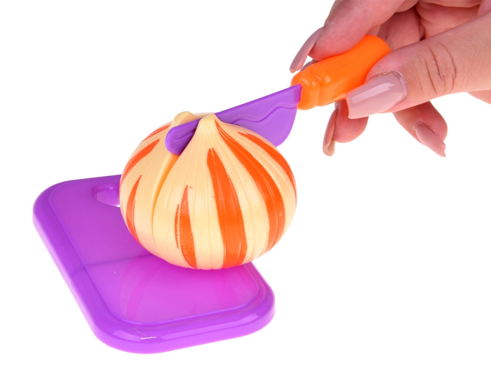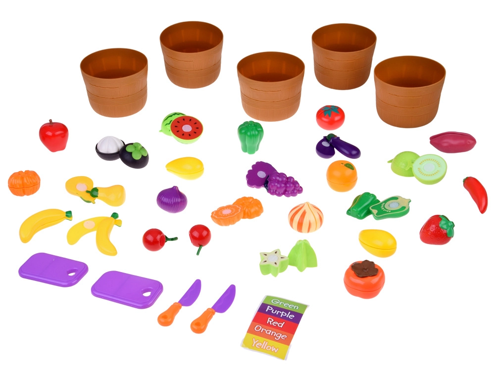 Sættet indeholder robuste kurve med farvede etiketter, to skærebrætter og to sikre knive til at træne korrekt greb og hånd-øje-koordination. Legen udvikler finmotorik, logisk tænkning, ordforråd og kreativitet.