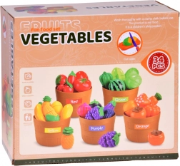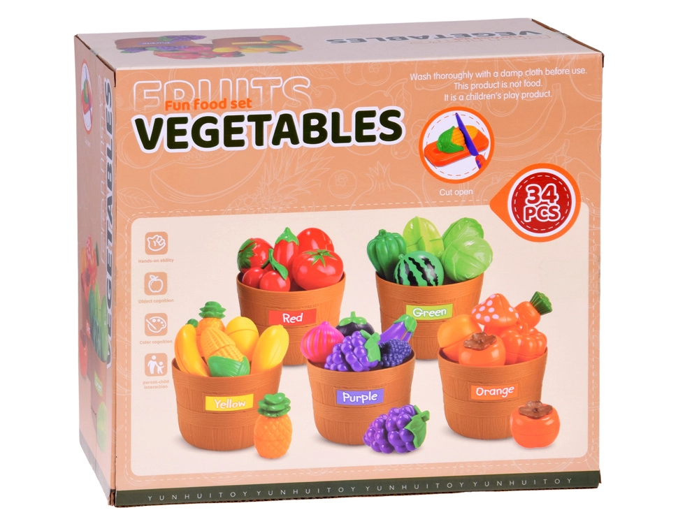 Dette store sæt med plastmad til børn kombinerer sjov og læring. Børn kan “skære” stykkerne i halve og samle dem igen med velcro, sortere dem efter farve i kurvene og på en legende måde lære navnene på frugter og grøntsager. Realistiske former og klare farver indbyder til udforskning og pretend play i børnekøkkenet.