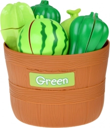 To skærebrætter, to knive og masser af frugter og grøntsager i forskellige farver stimulerer fantasien og rolleleg som madlavning, butik eller restaurant.