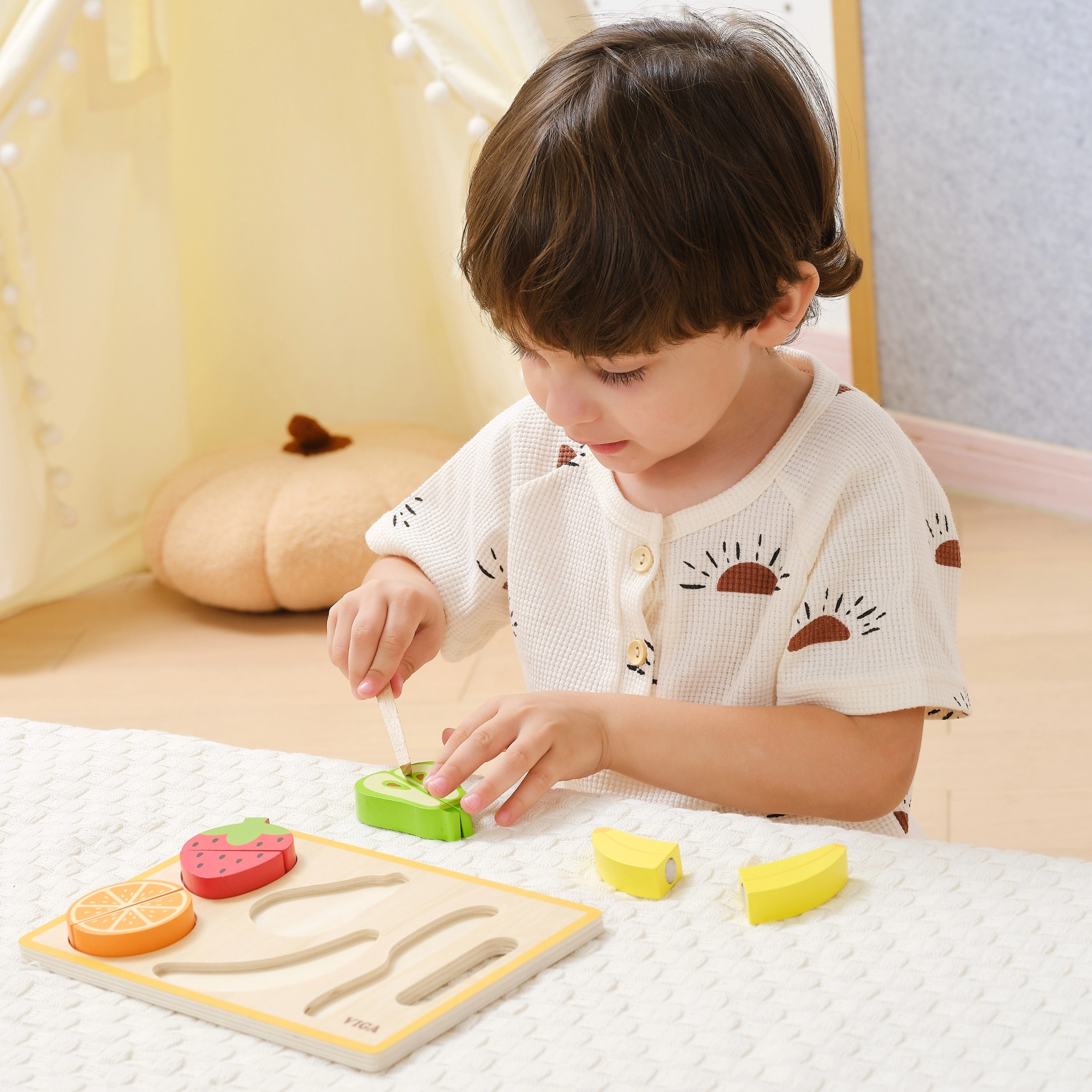 Hver frugt er opdelt i segmenter, som holdes sammen af velcro, der giver en autentisk fornemmelse og lyd ved skæring. Perfekt til træning af øje–hånd-koordination.
