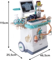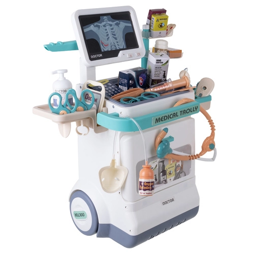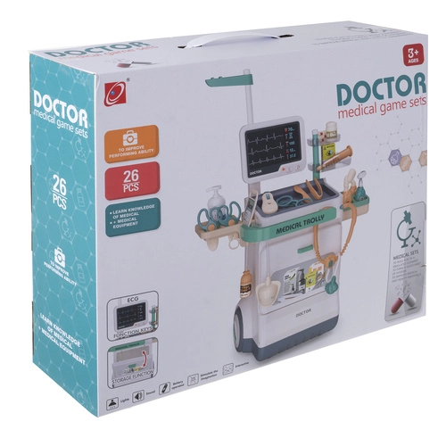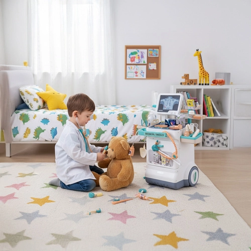 Den mobile børnelægestation giver realistisk lægeleg derhjemme. Den to-niveaude vogn med hjul, EKG/RTG-skærm og rigt tilbehør lader børn tage sig af patienter – både bamser og familiemedlemmer. Lys- og lydeffekter (hjerteslag, EKG-signal) vækker nysgerrigheden og viser, hvordan en klinik fungerer.